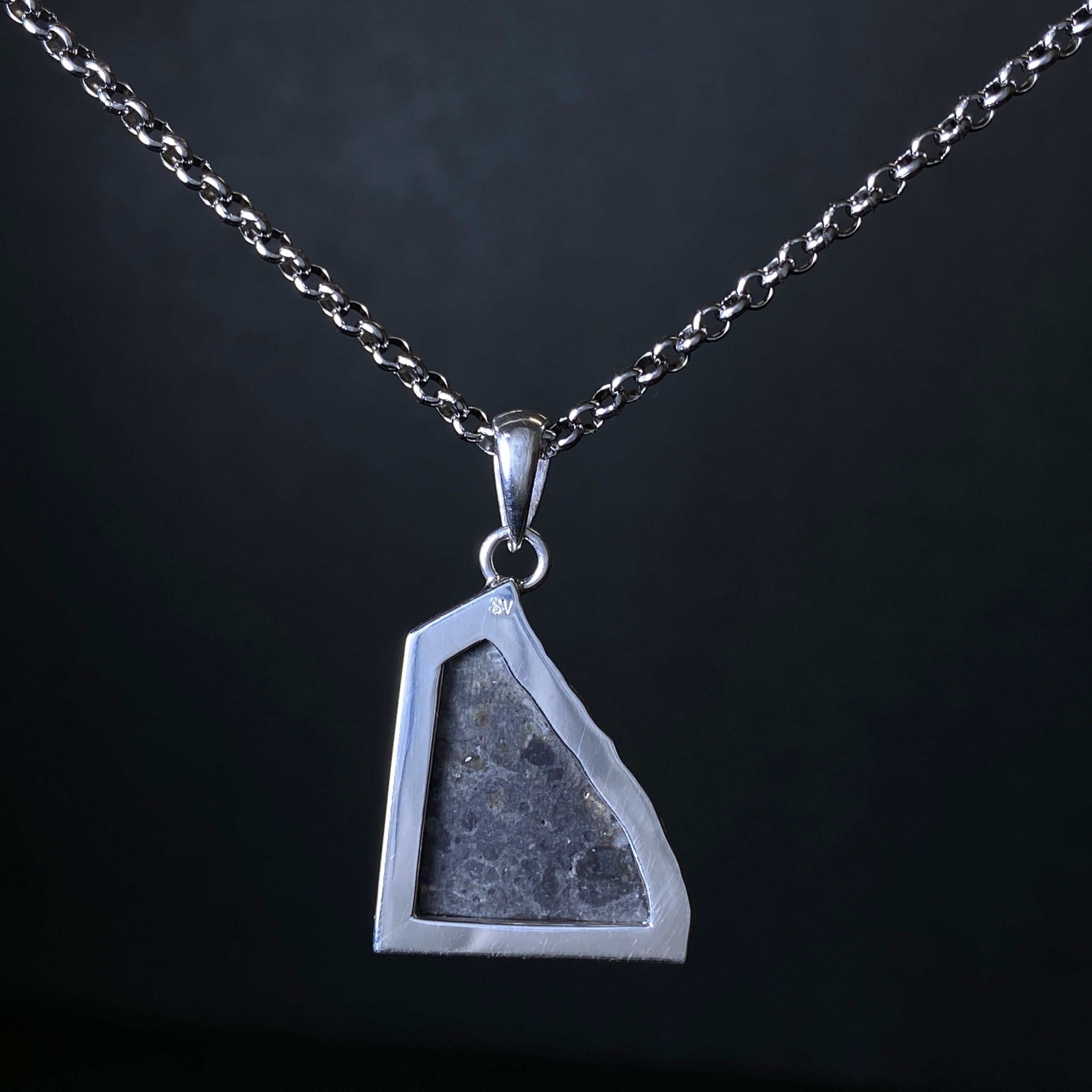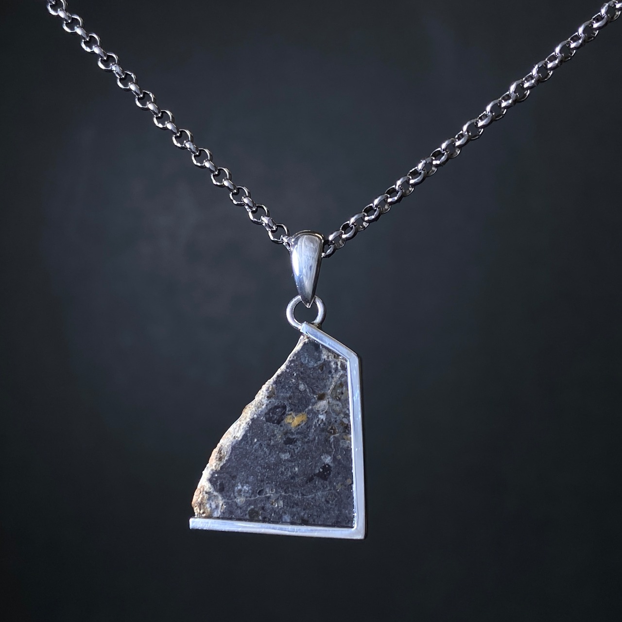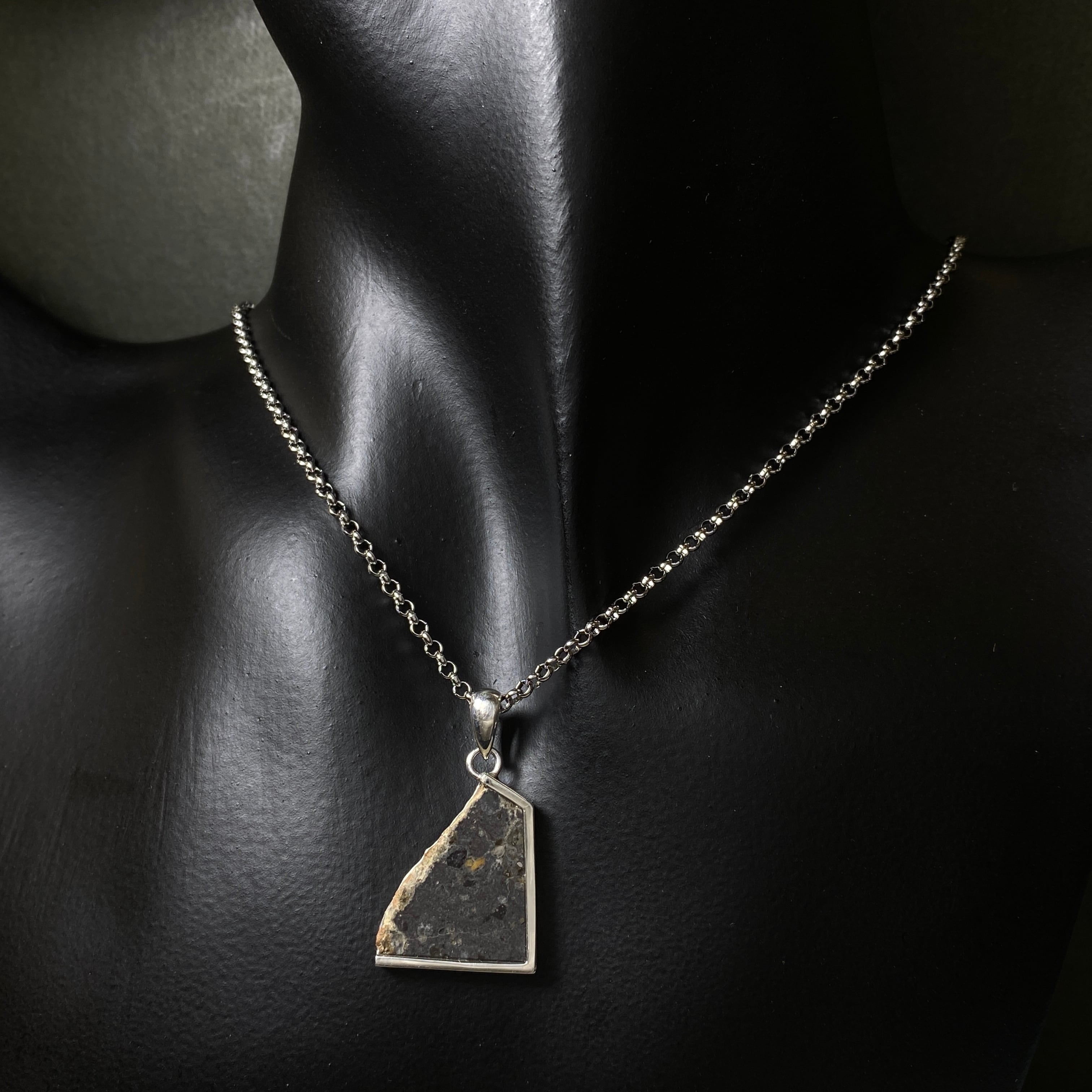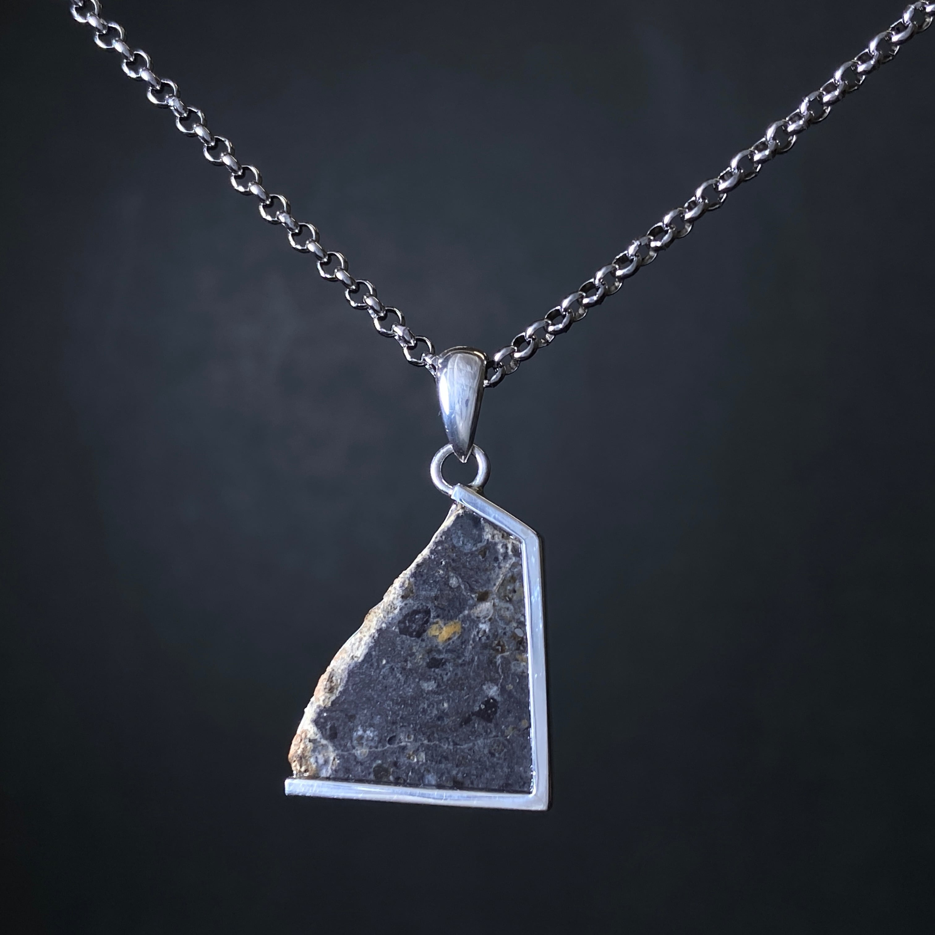 2022年の春にアルジェリアで回収された月の隕石です。惑星などが月に衝突した勢いで欠けた月の一部が宇宙を浮遊します。その欠片は軌道を描き、地球に衝突するまで何百万年も宇宙を浮遊します。なぜ月の隕石という事が分かるのかというと、アポロ計画が関係しています。アポロ計画で月の岩石が地球に持ち運ばれ、その組織構造などをデータ化しました。それにより科学的に月の隕石であると証明することができます。唯一肉眼で見られる隕石なので、世界的に人気のある隕石です。