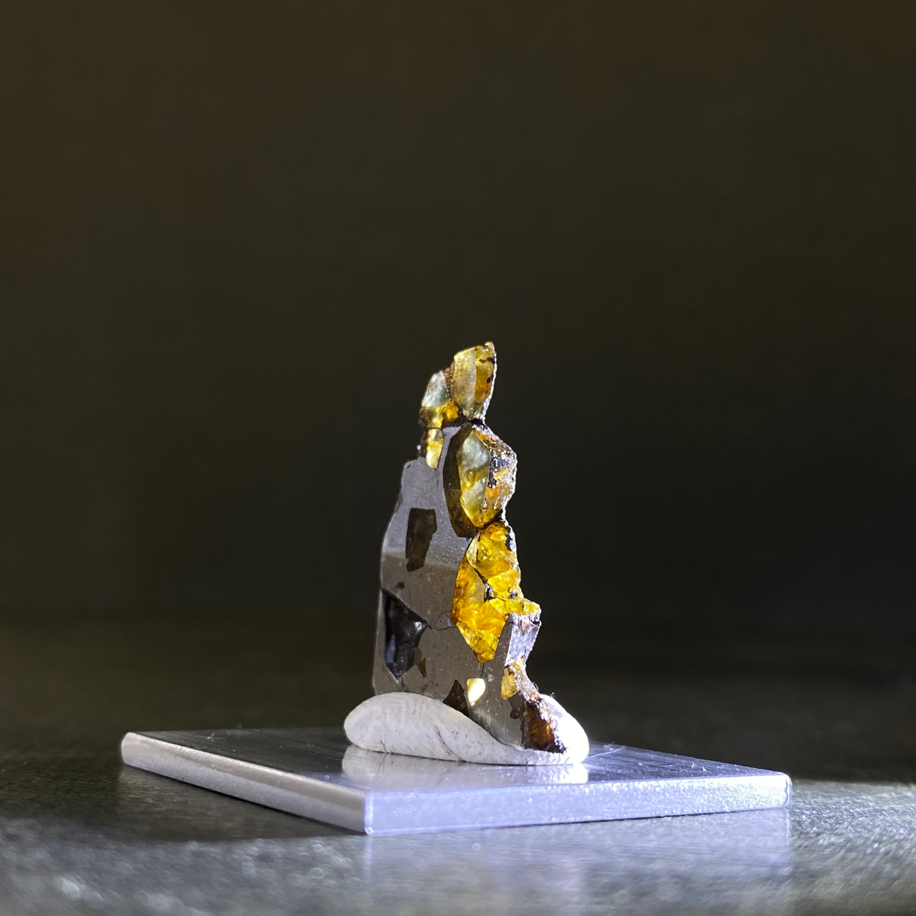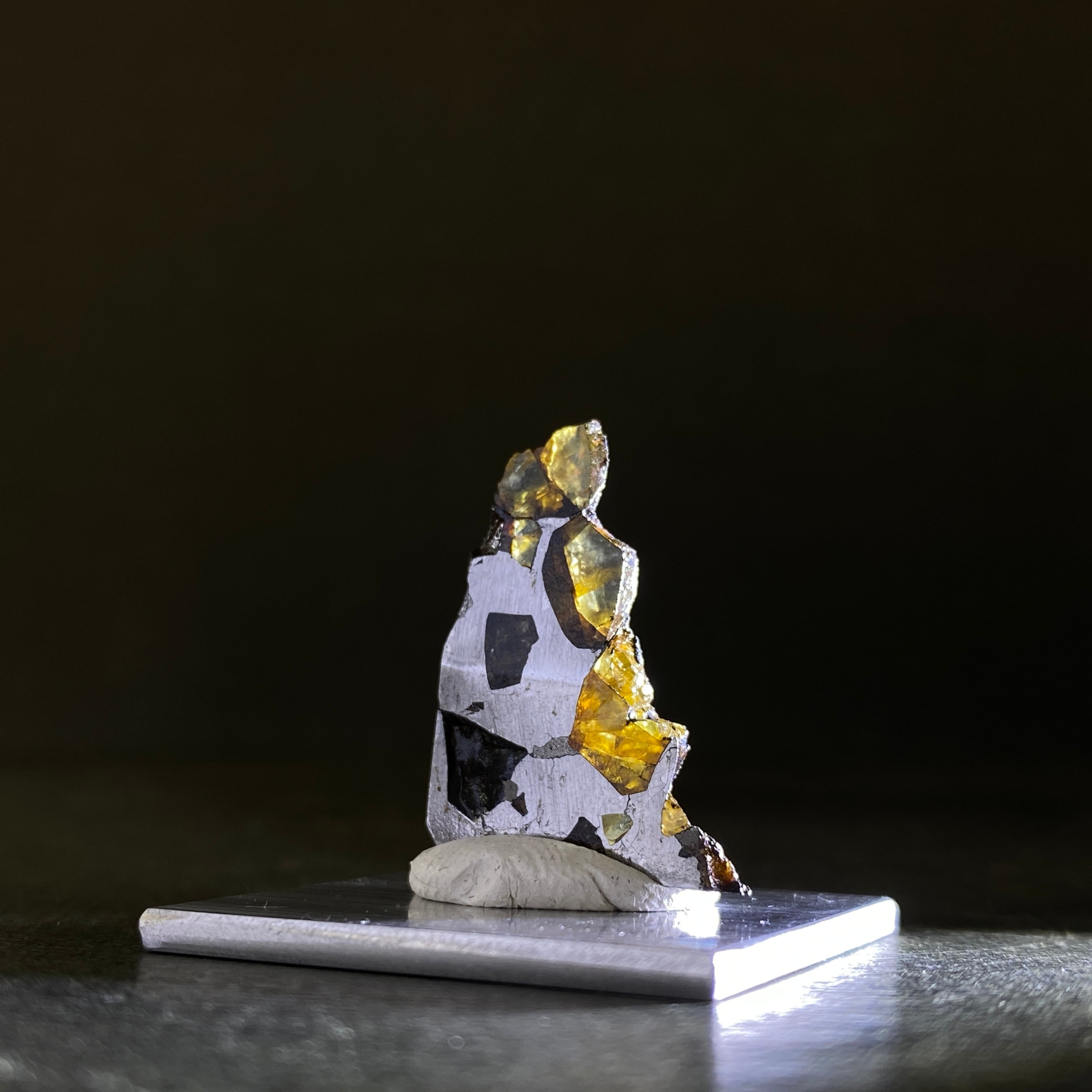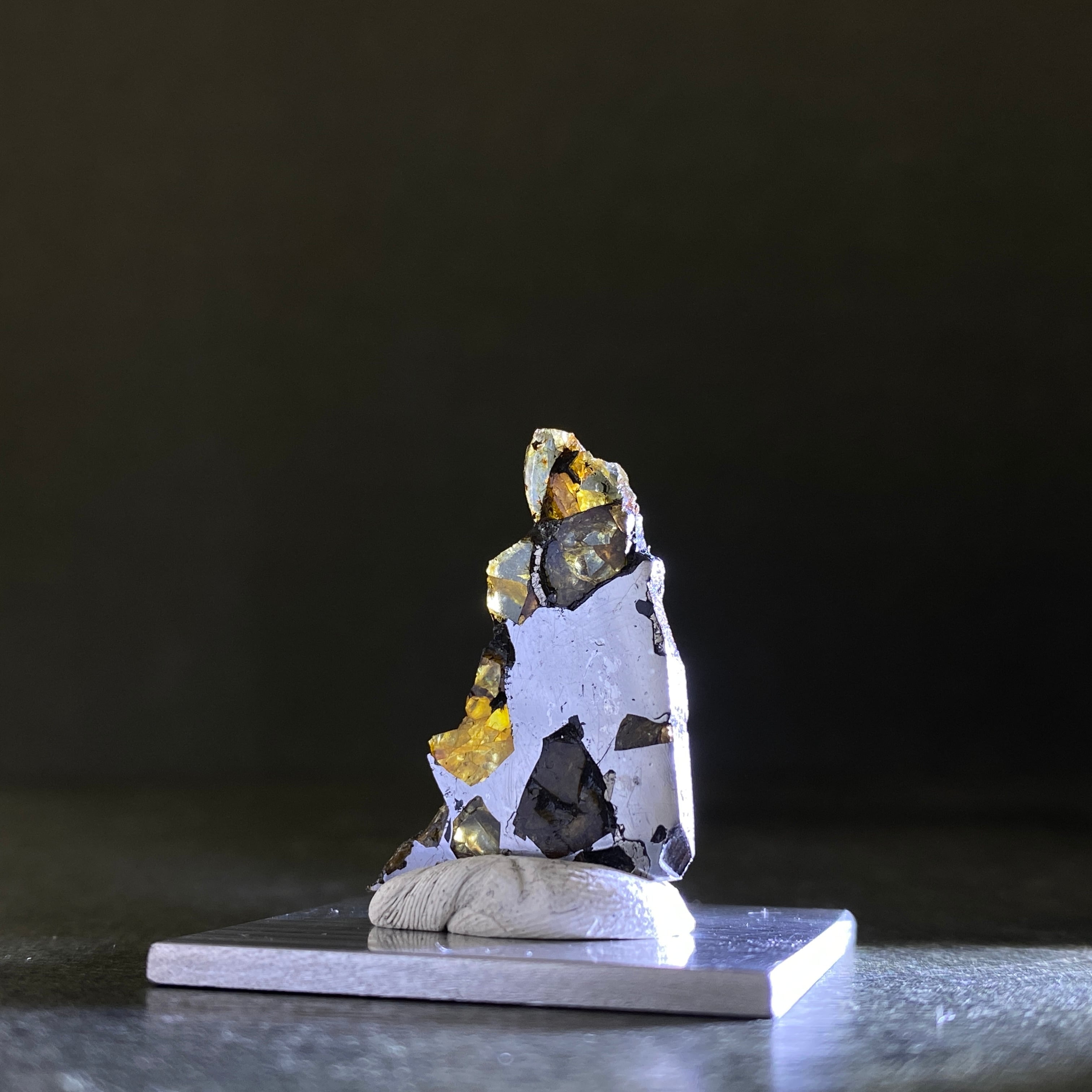 1807年にベラルーシにて2人の農民のよって発見された隕石です。諸説ありますが、分裂した小惑星のコアマントルの境界線の部分になります。この隕石は地球に落下するまでに別の隕石の衝突によって宇宙空間で粉砕されたようです。カンラン石の透明度はパラサイト隕石の中でも透明度が高く、パラサイトペリドットとして宝石などに使われています。