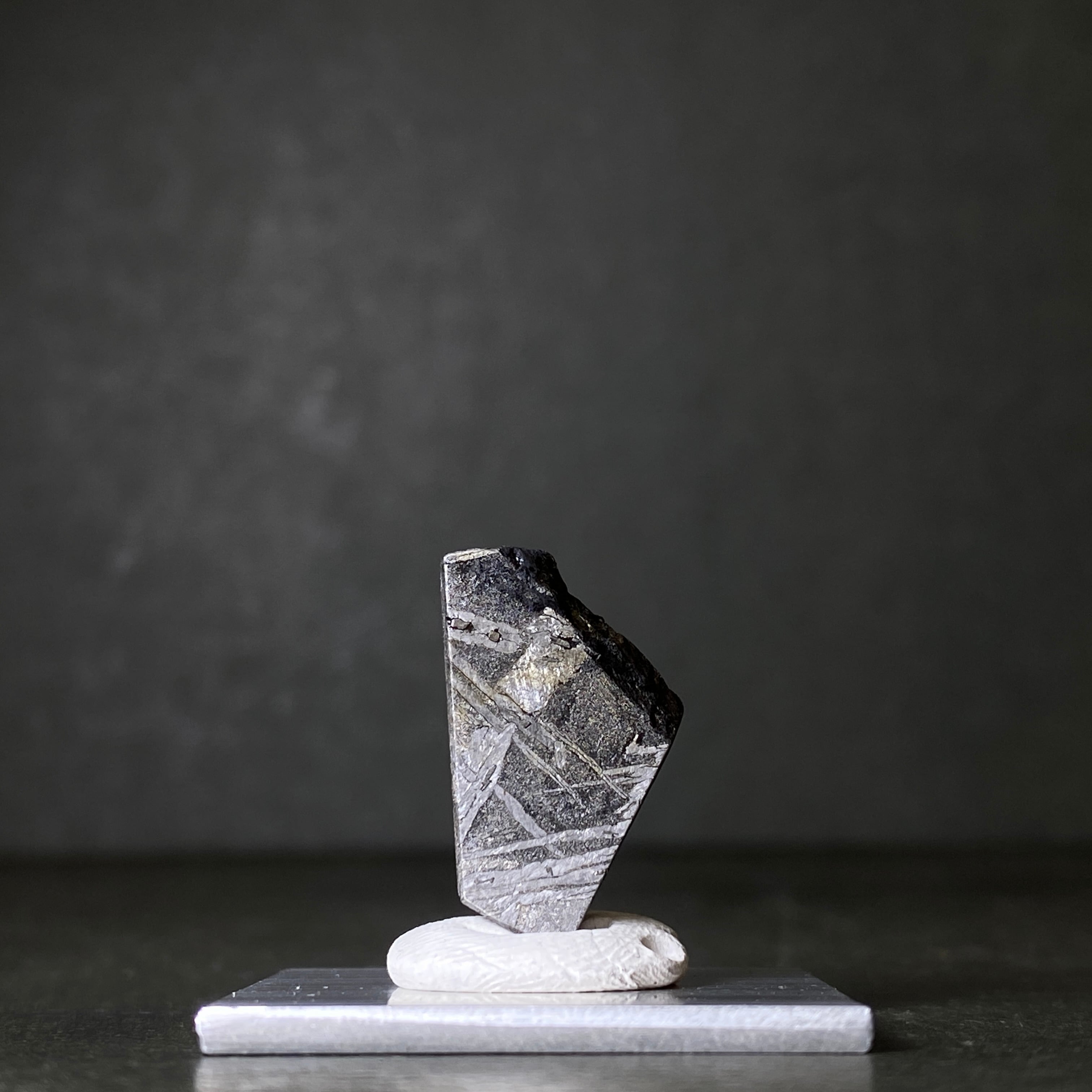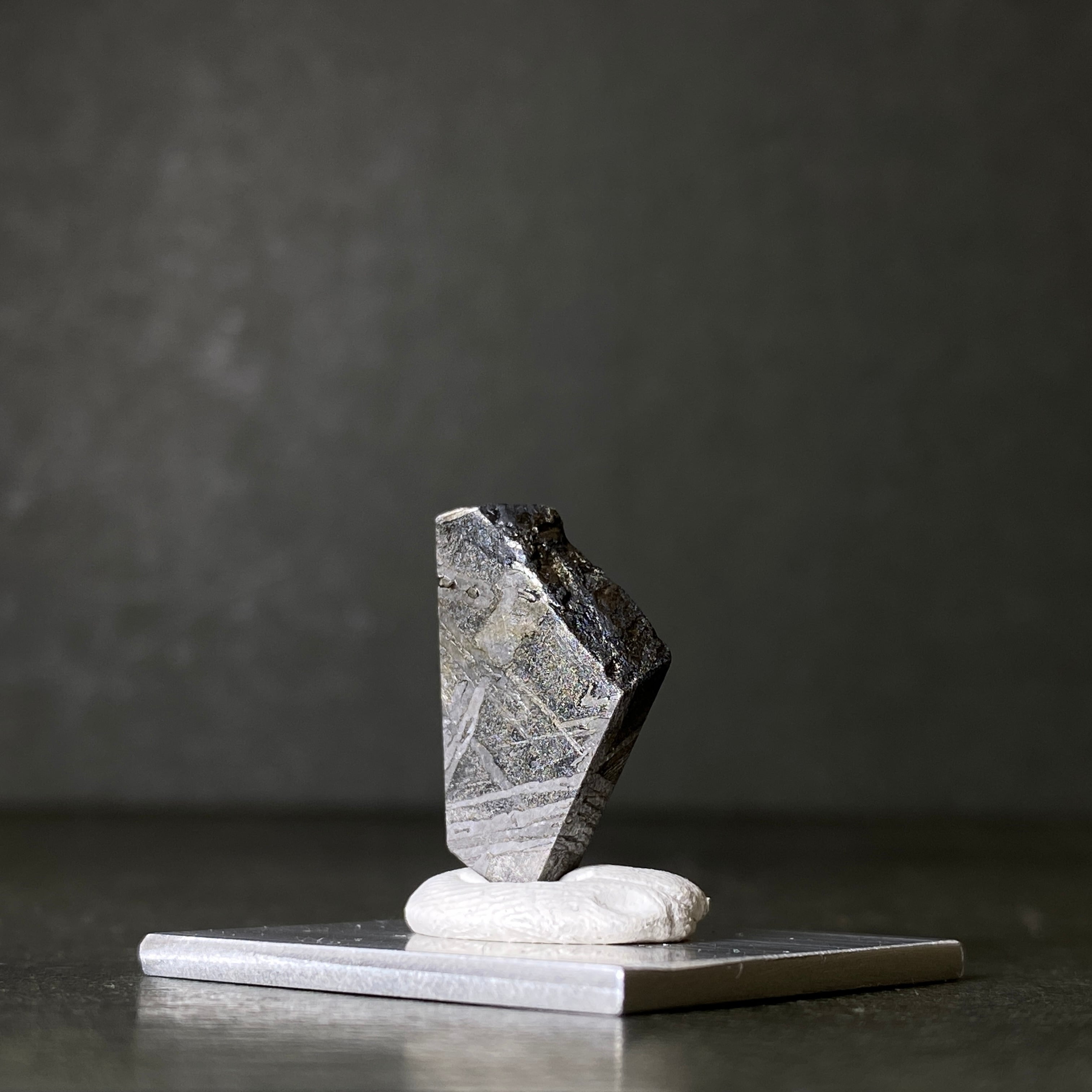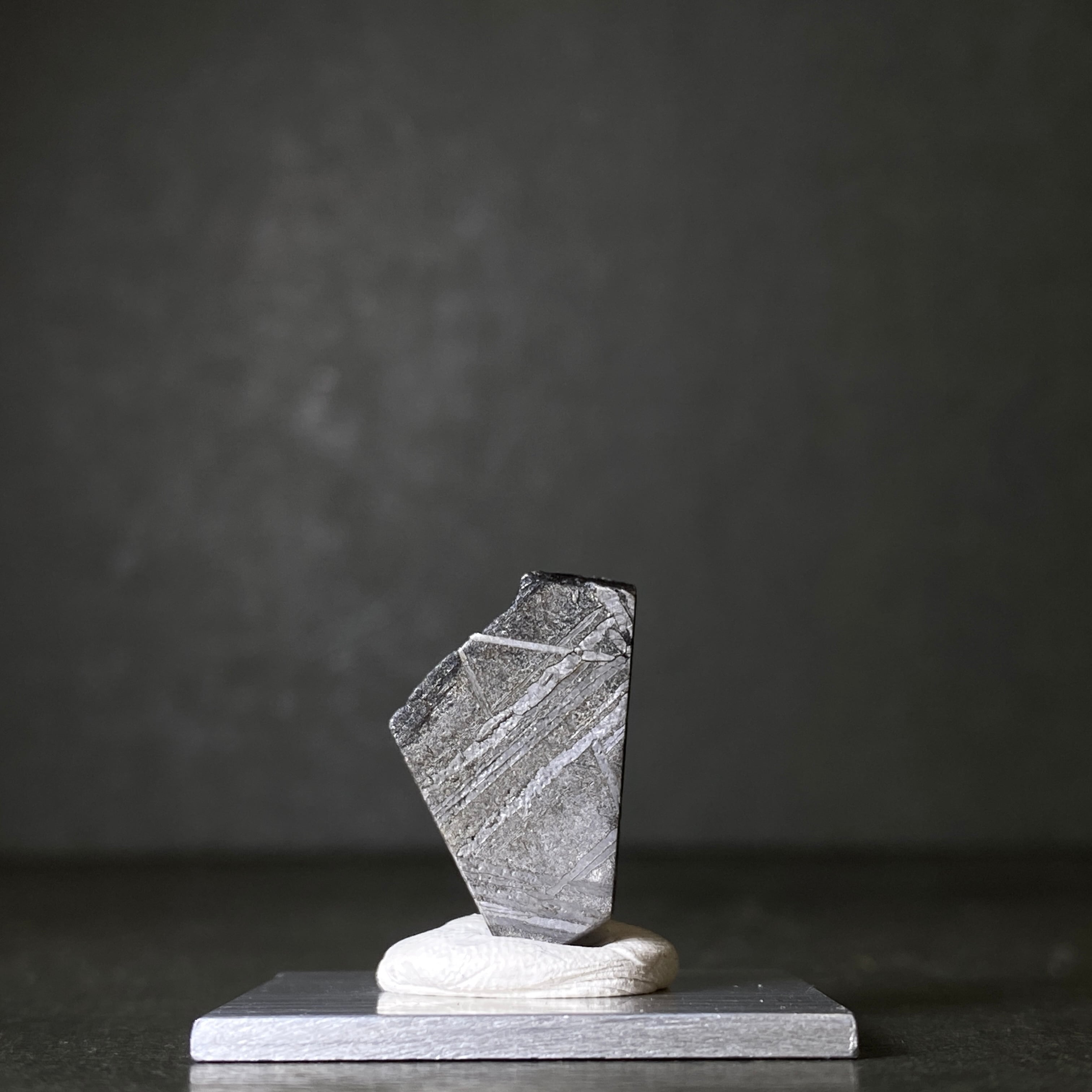 1968年にフランスで発見された隕石です。珍しいヨーロッパの鉄隕石で、シャンパンやワインに使われるぶどう畑で回収されました。サントーバン隕石の特徴はなんといっても特別な切断面です。独特なウィドマンシュテッテン構造にトロイライトの小結晶、そして異常なまでに大きいシュライバーサイトが見られます。局所的にサビが出るのも特徴的で、ウィドマンシュテッテン構造に沿って四角く出るのはこの隕石だけです。側面に多いトロイライトも同様に四角くなっています。どんな隕石とも似つかない特別な隕石であることは間違いありません。