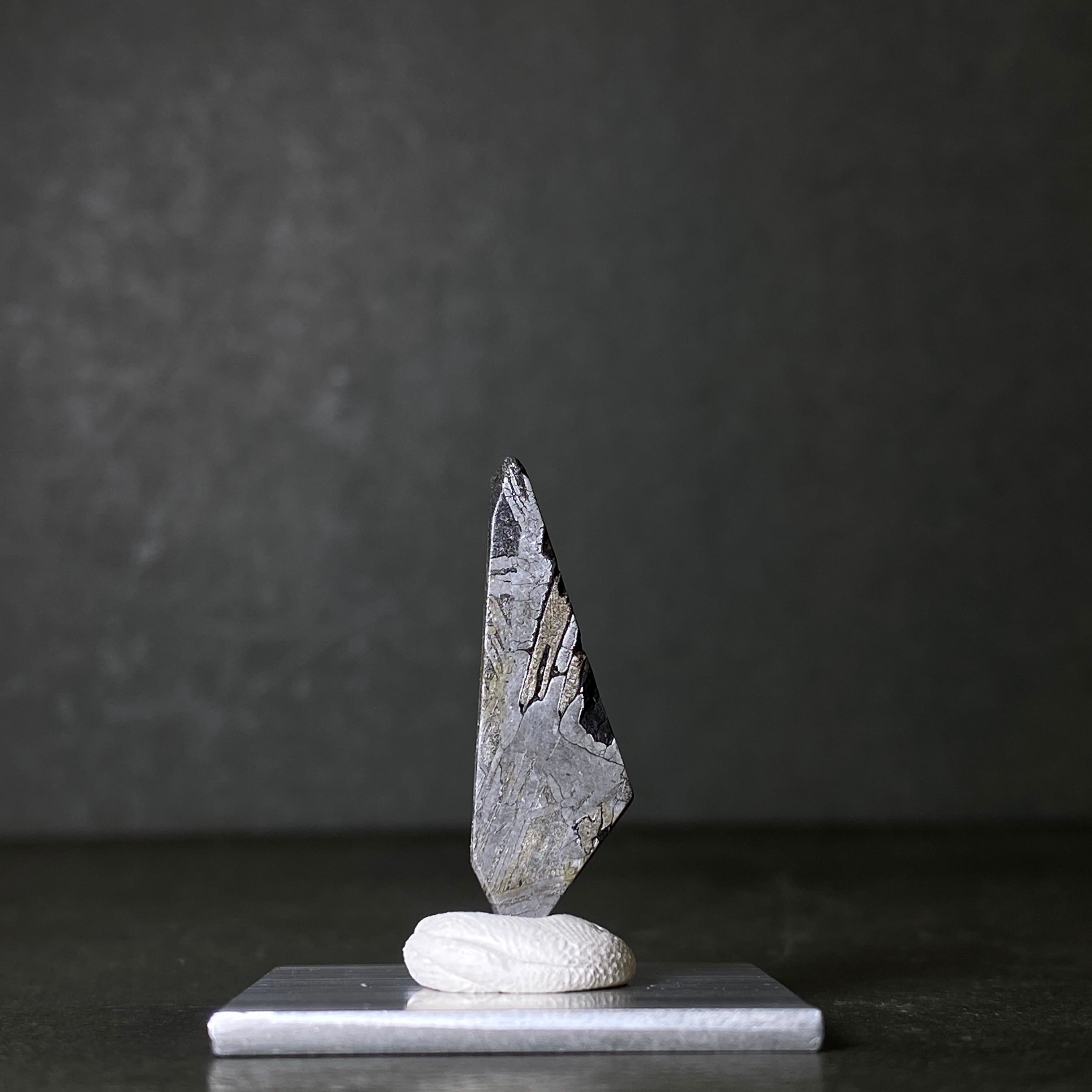 1968年にフランスで発見された隕石です。珍しいヨーロッパの鉄隕石で、シャンパンやワインに使われるぶどう畑で回収されました。サントーバン隕石の特徴はなんといっても特別な切断面です。独特なウィドマンシュテッテン構造にトロイライトの小結晶、そして異常なまでに大きいシュライバーサイトが見られます。局所的にサビが出るのも特徴的で、ウィドマンシュテッテン構造に沿って四角く出るのはこの隕石だけです。側面に多いトロイライトも同様に四角くなっています。どんな隕石とも似つかない特別な隕石であることは間違いありません。