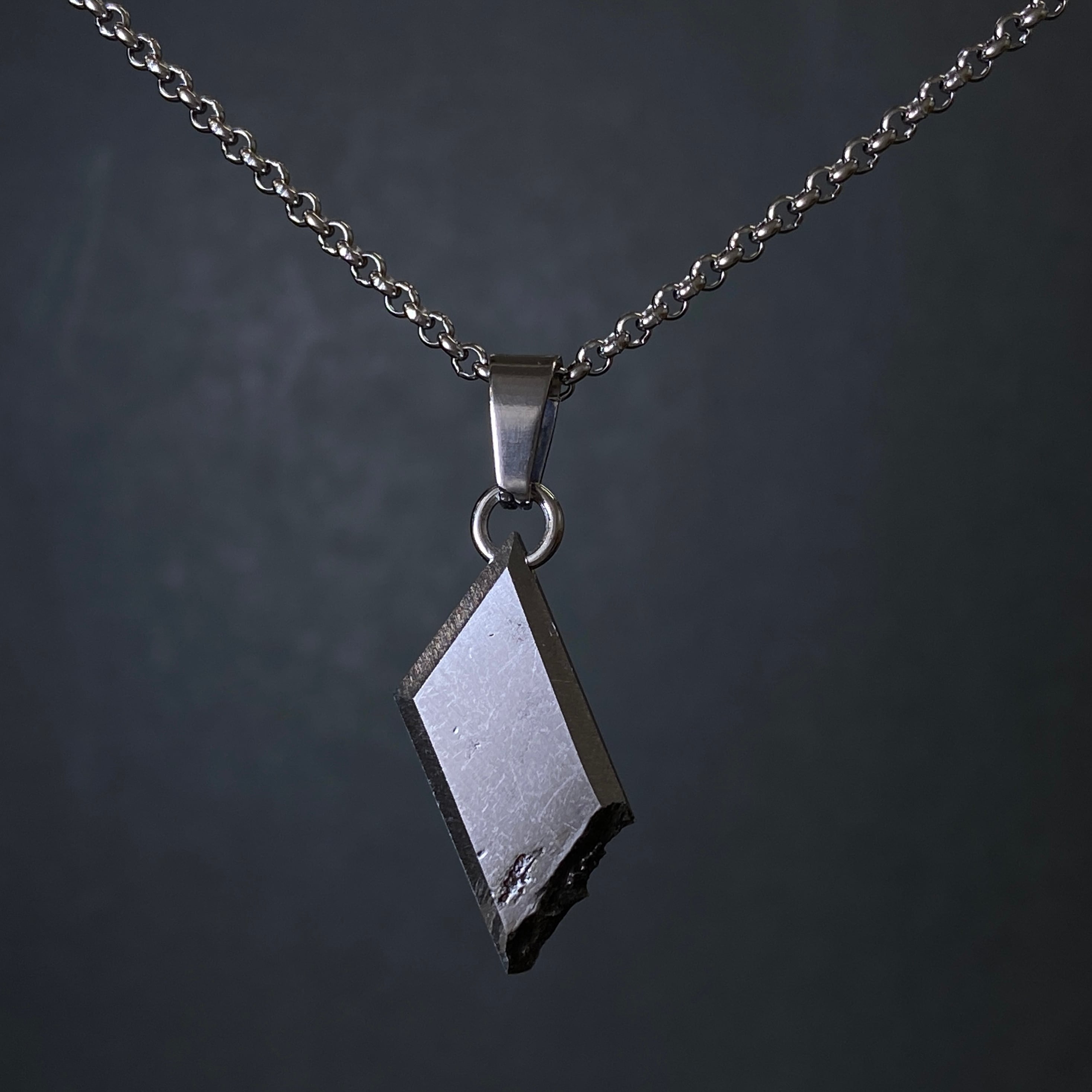 2000年にロシアで発見された隕石です。鉄隕石の一種で、ウィドマンシュテッテン構造が出ないアタキサイトに分類されます。それは隕石の主成分である鉄とニッケルの成分比の違いによるもので、ドロニノ隕石はニッケルが25%以上あるのが特徴です。そのためスライス品の鏡面仕上げが一般的で、その断面にトロイライトという黒いポツポツがあるのも特徴の1つです。