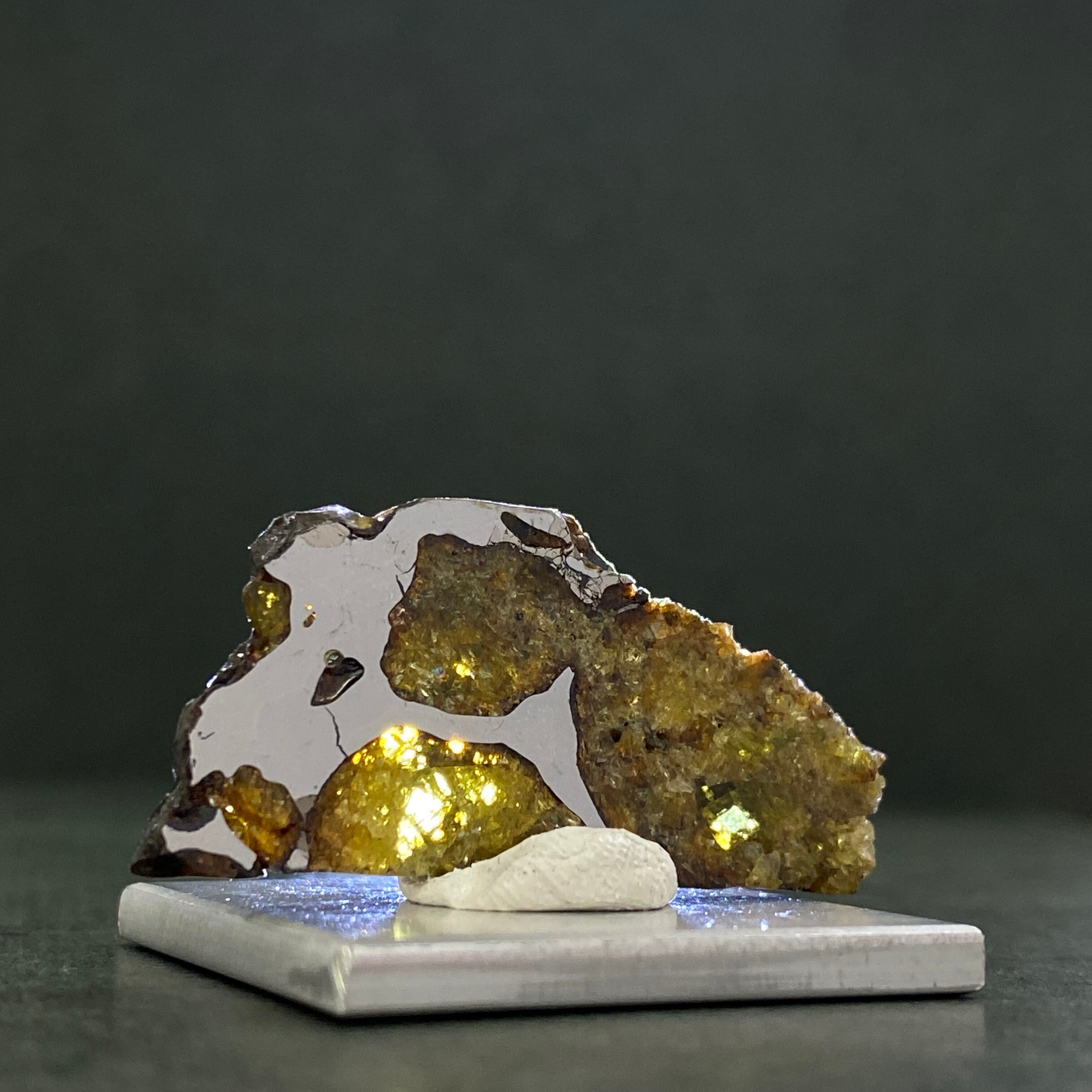 1822年にチリで発見された隕石です。パラサイト隕石自体の回収量は全体の約1%で希少なのですが、イミラックはその中でも希少かつ人気の隕石です。そのカンラン石は大きく、透明度が高いです。イエローグリーンに輝くその様は、宇宙の宝石と呼ばれるほどです。サビにくさも人気の1つです。美しいそのフォルムを美しいまま、いつまでの楽しめる隕石です。