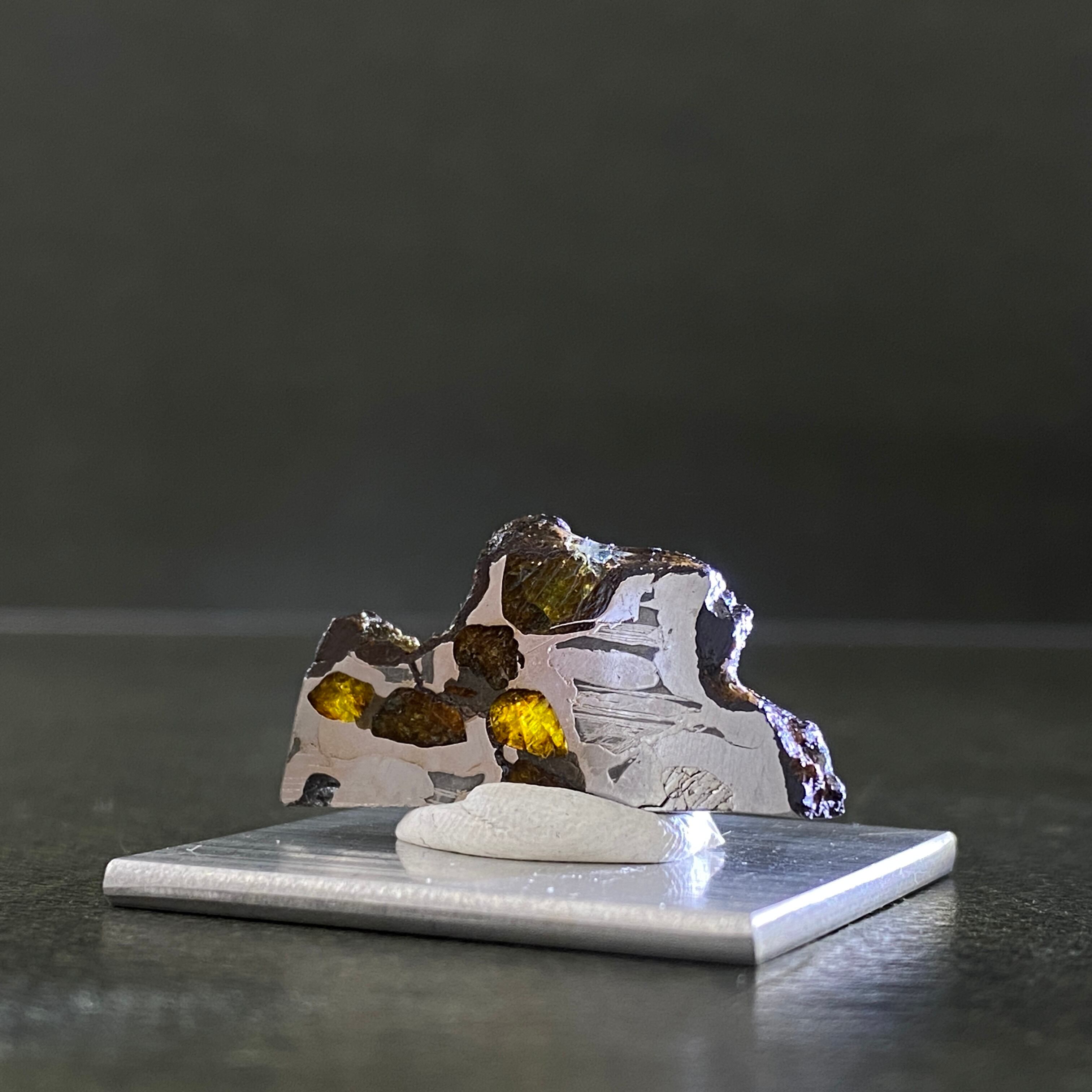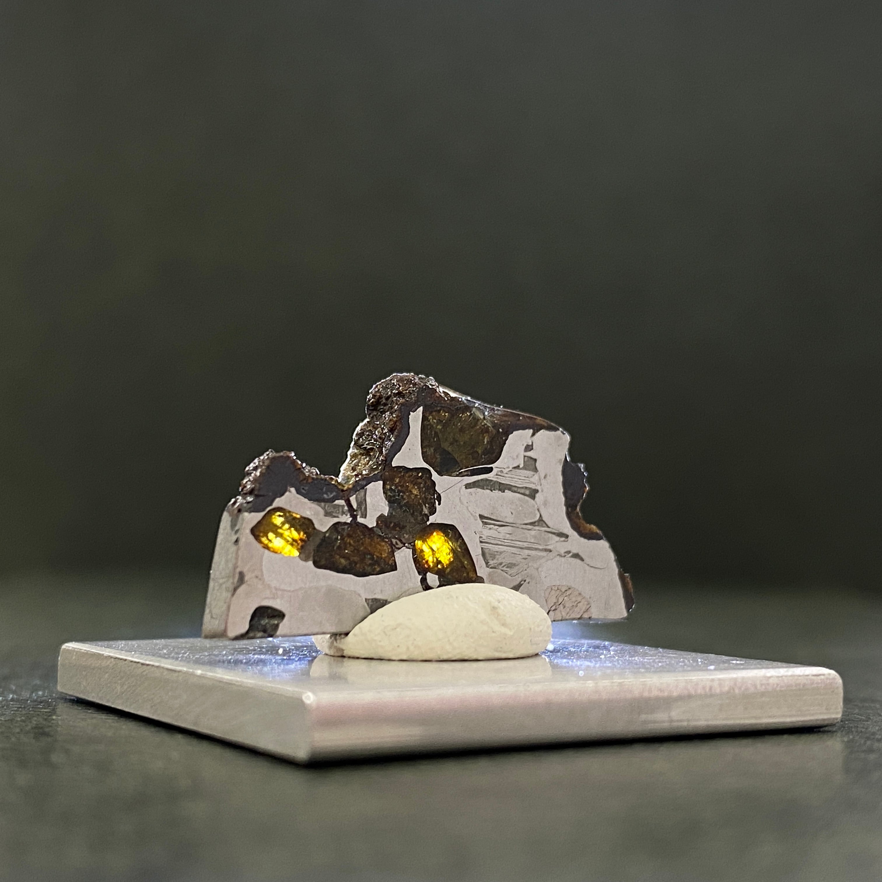 1822年にチリで発見された隕石です。パラサイト隕石自体の回収量は全体の約1%で希少なのですが、イミラックはその中でも希少かつ人気の隕石です。そのカンラン石は大きく、透明度が高いです。イエローグリーンに輝くその様は、宇宙の宝石と呼ばれるほどです。サビにくさも人気の1つです。美しいそのフォルムを美しいまま、いつまでの楽しめる隕石です。
