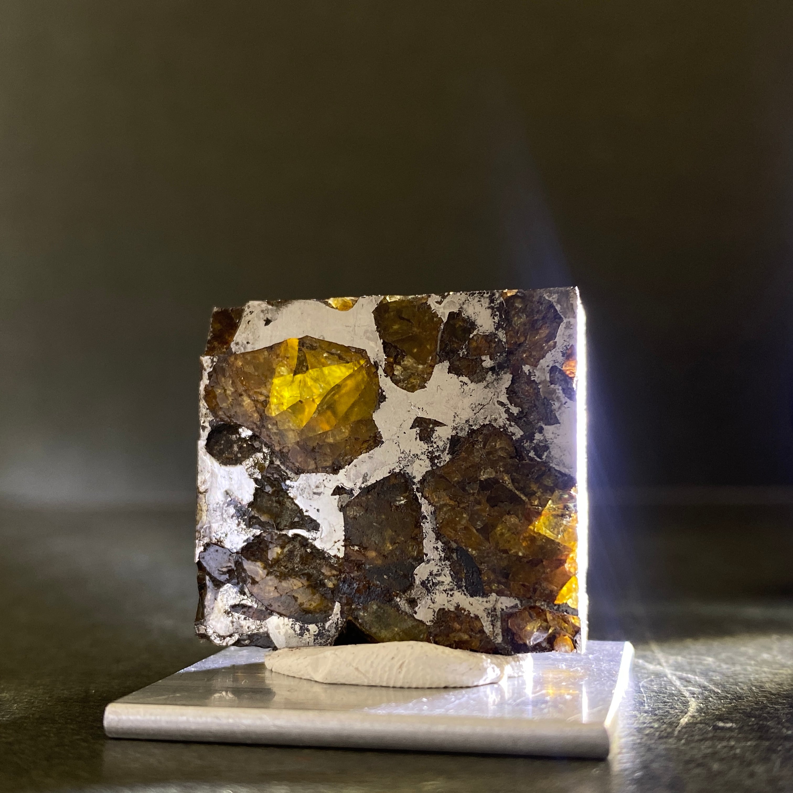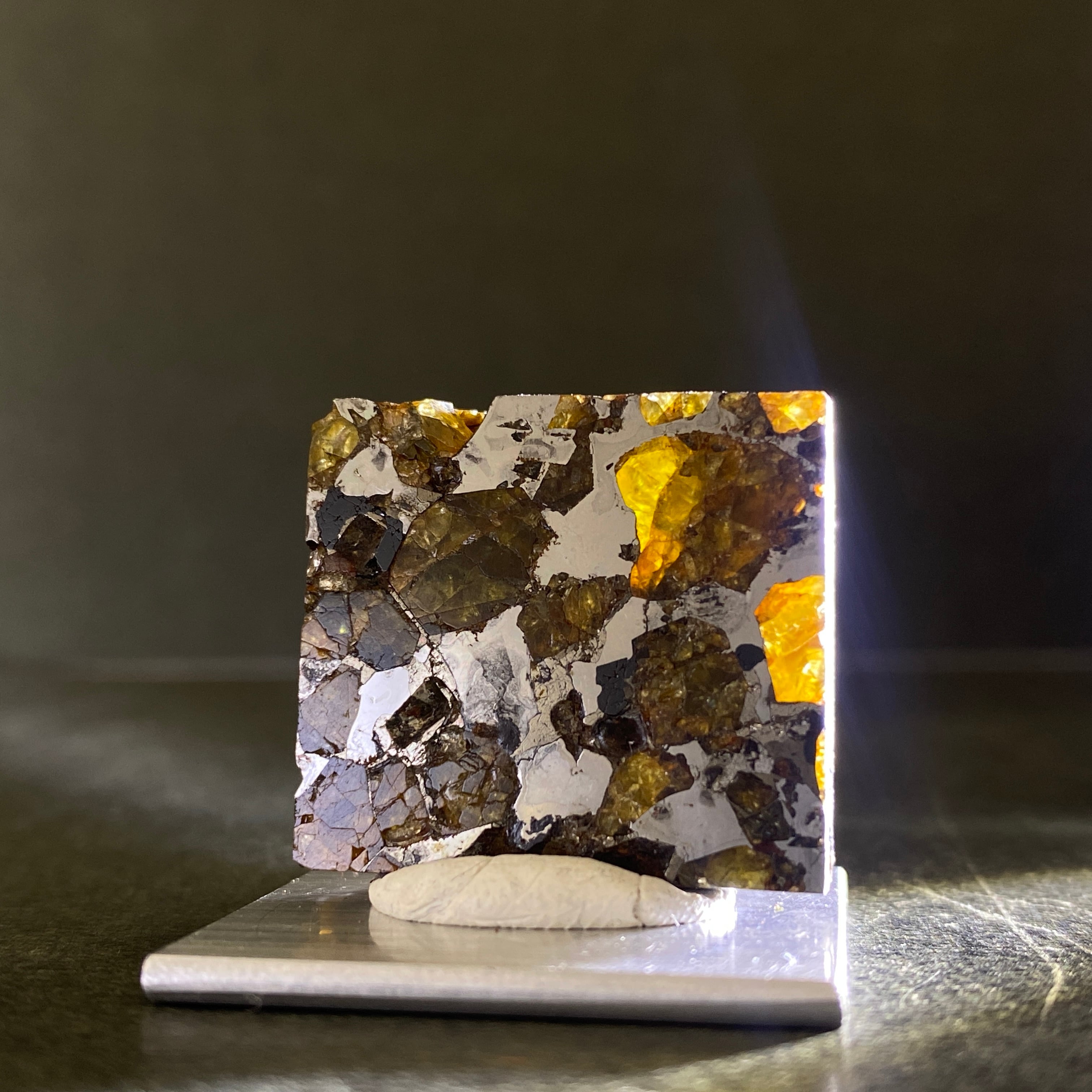 1807年にベラルーシにて2人の農民のよって発見された隕石です。諸説ありますが、分裂した小惑星のコアマントルの境界線の部分になります。この隕石は地球に落下するまでに別の隕石の衝突によって宇宙空間で粉砕されたようです。カンラン石の透明度はパラサイト隕石の中でも透明度が高く、パラサイトペリドットとして宝石などに使われています。