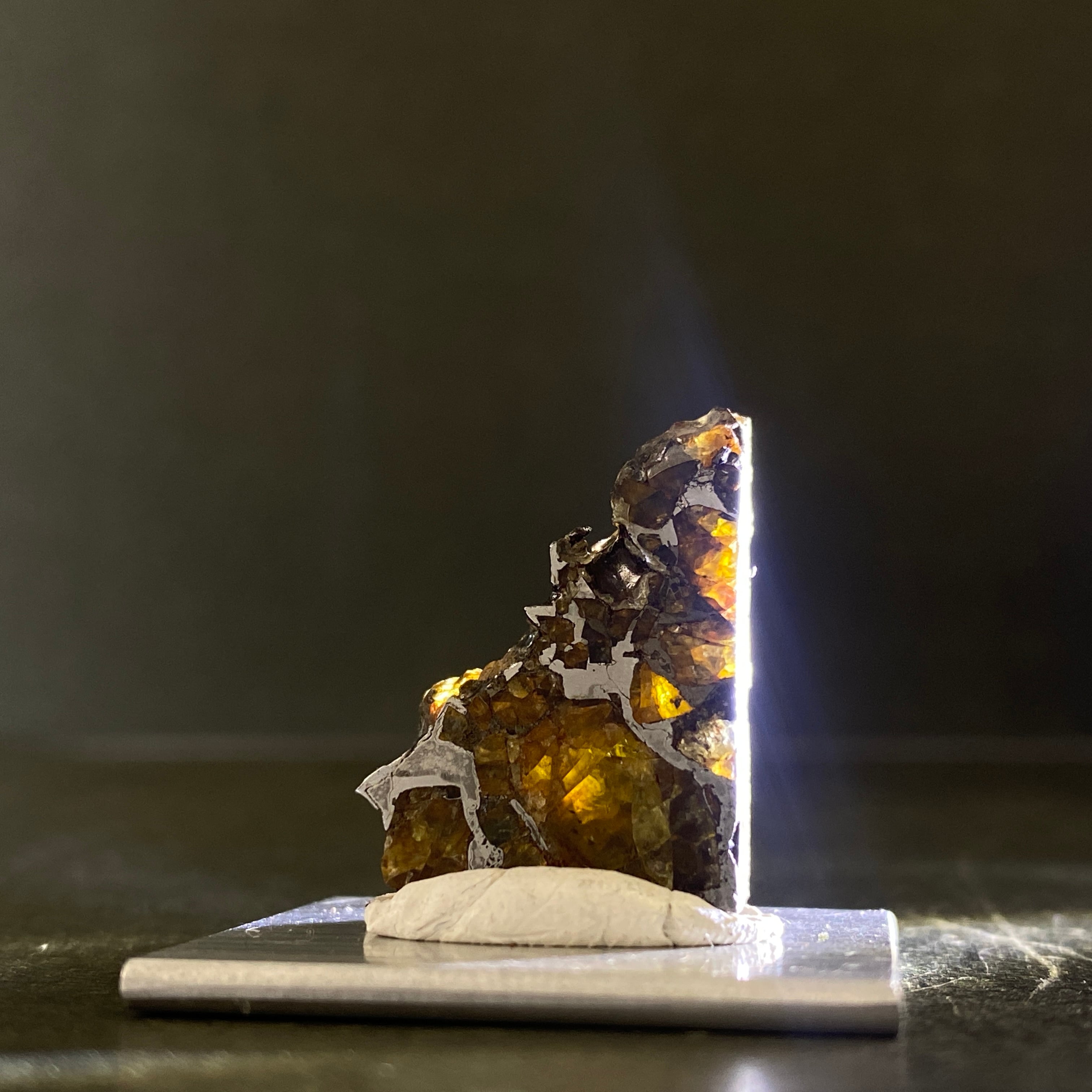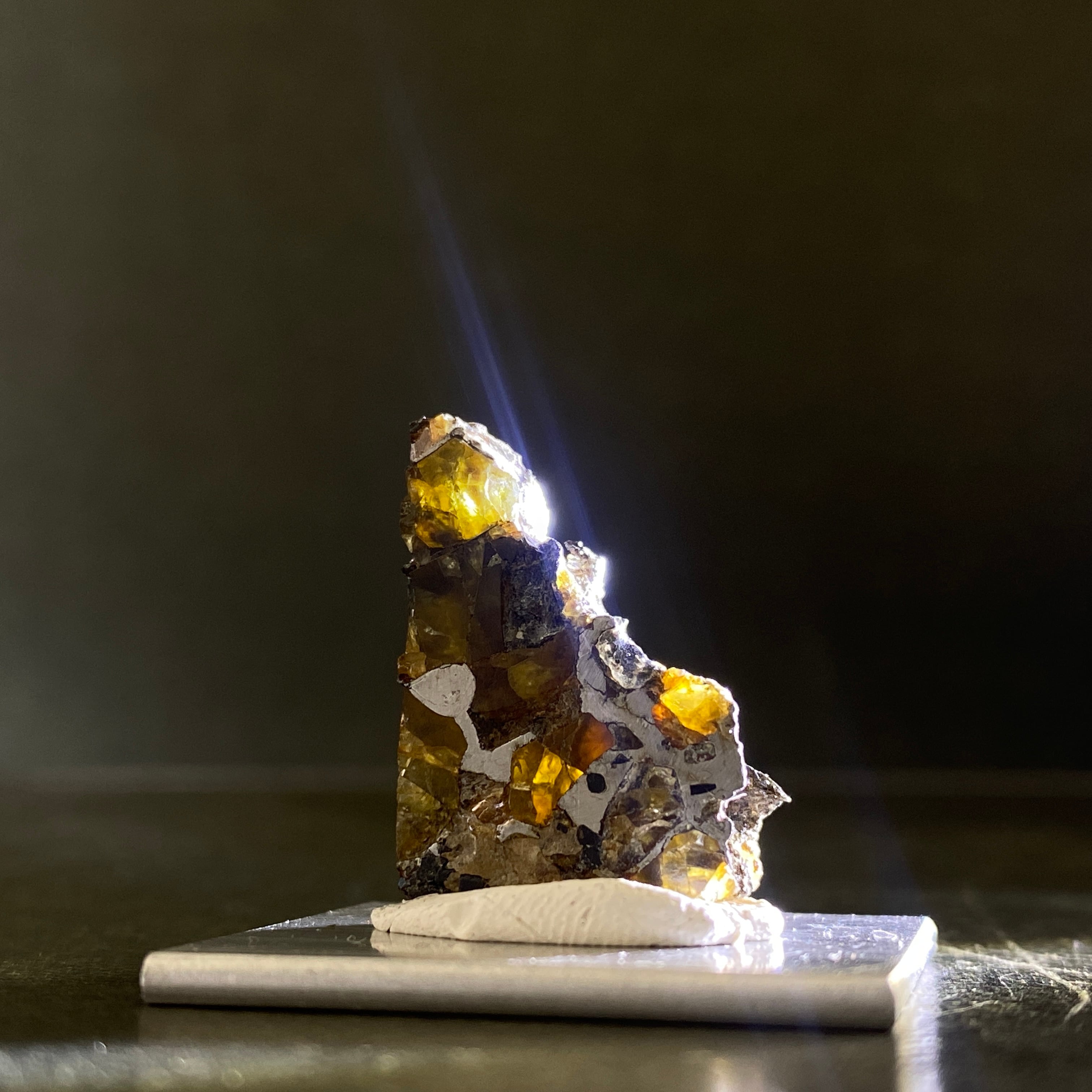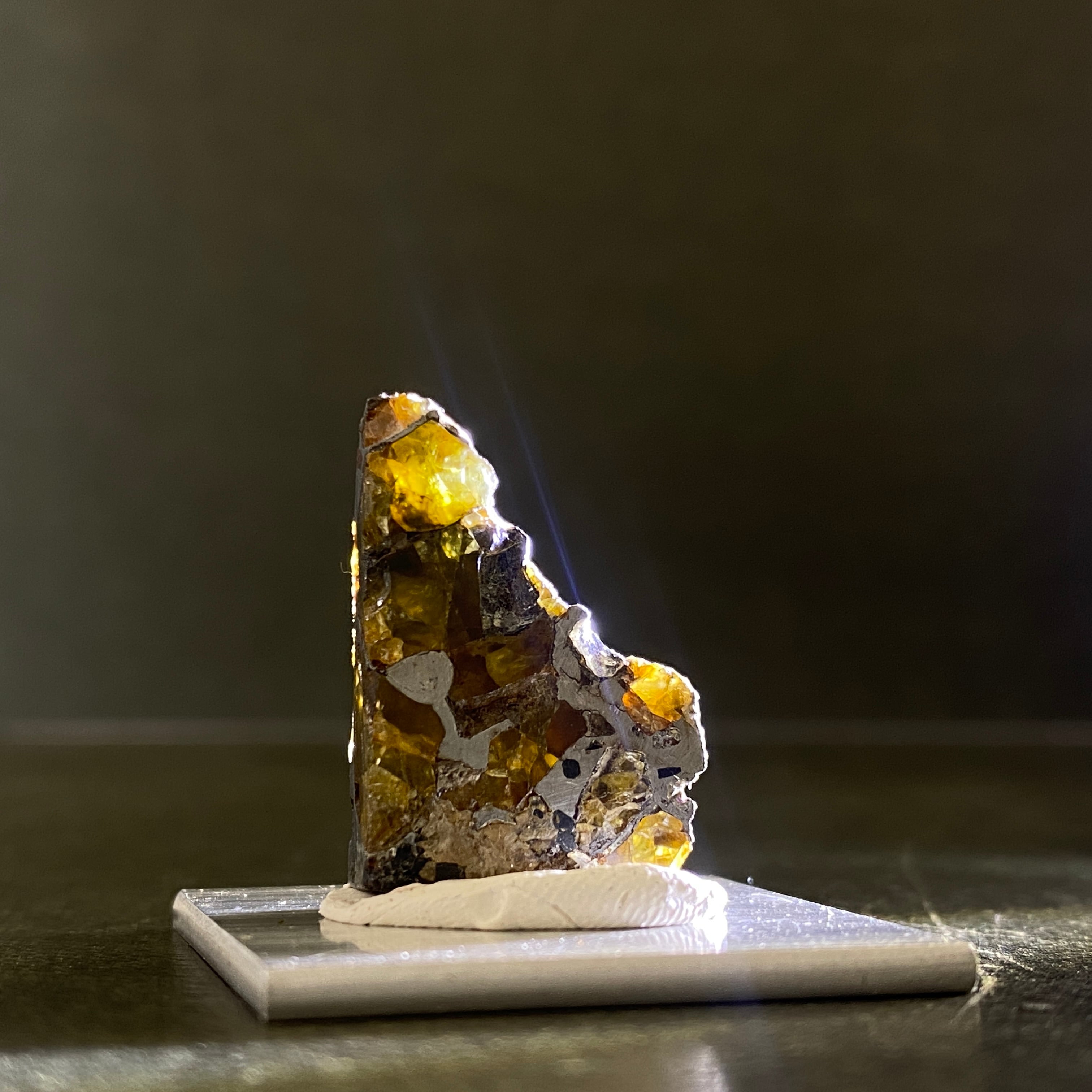 1807年にベラルーシにて2人の農民のよって発見された隕石です。諸説ありますが、分裂した小惑星のコアマントルの境界線の部分になります。この隕石は地球に落下するまでに別の隕石の衝突によって宇宙空間で粉砕されたようです。カンラン石の透明度はパラサイト隕石の中でも透明度が高く、パラサイトペリドットとして宝石などに使われています。