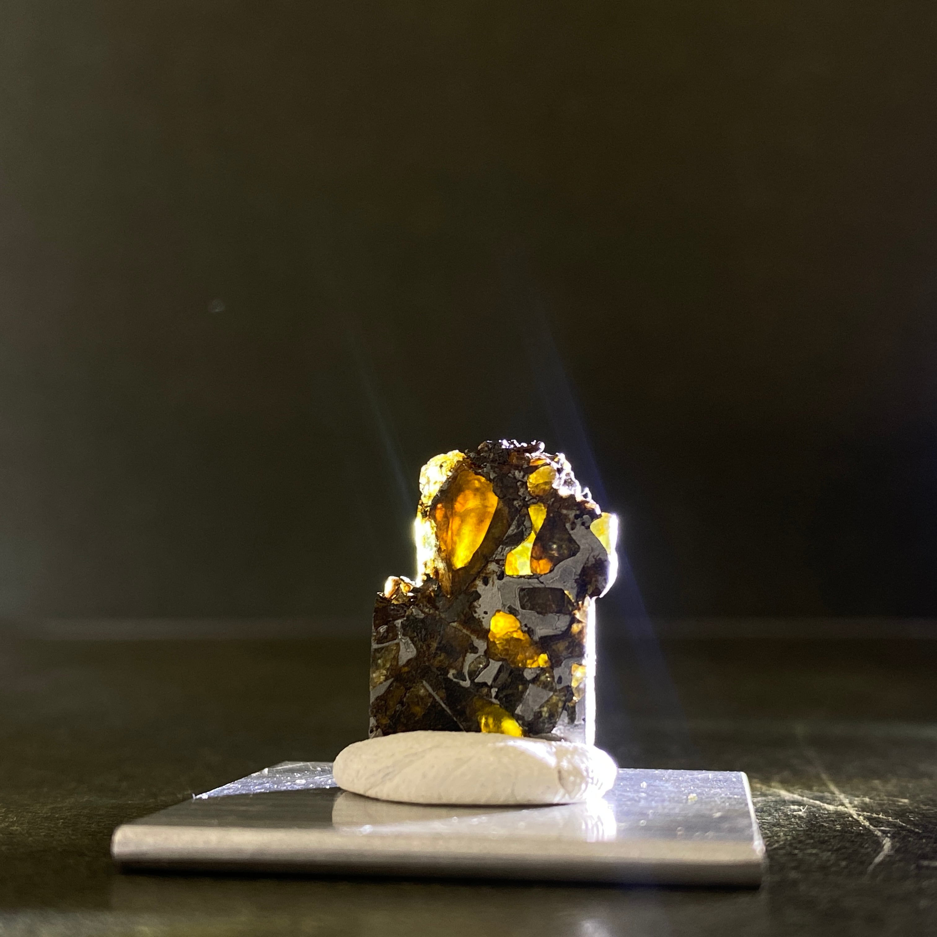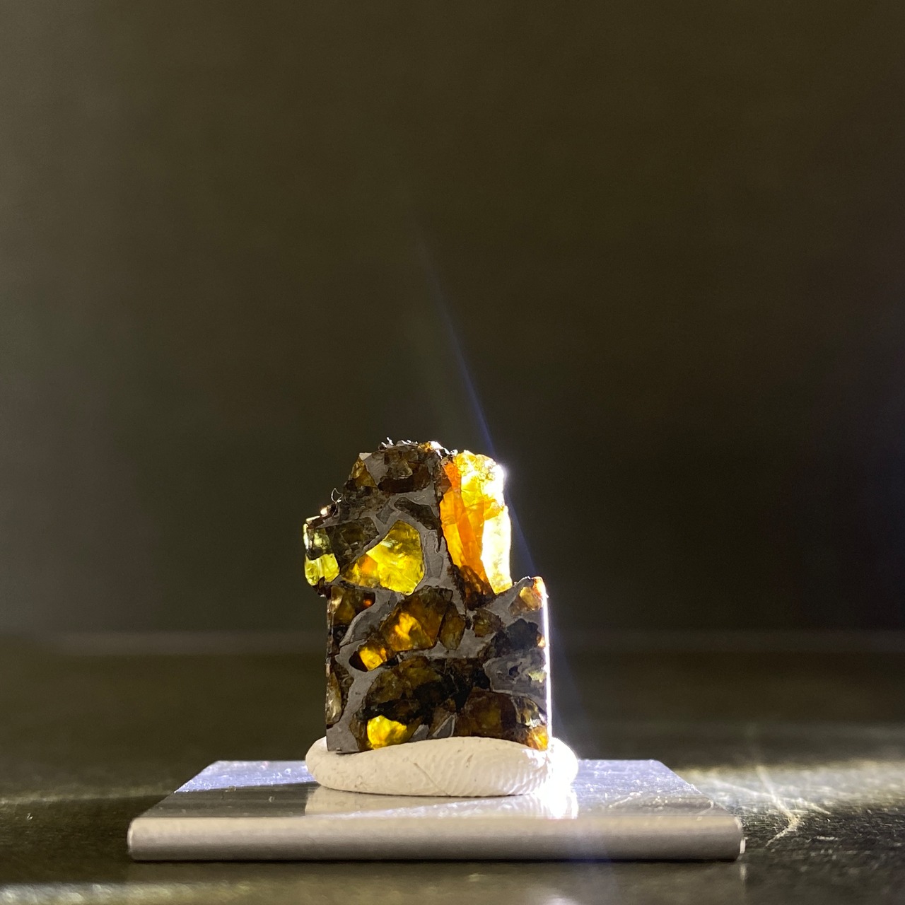 1881年にアメリカ・カンザス州で発見されたパラサイト隕石です。農作業中に初めて発見されました。その後100kg以上の個体をはじめ、いくつかの原石が発掘されました。小さくシャープなカンラン石が散らばっている切断面が特徴的で、透ける部分は透明度が非常に人気が高いです。パラサイト隕石といえばスライス品が一般的ですが、アドミア隕石はナゲット型(小さい原石)も人気があります。比較的大きめのカンラン石の部分は取れやすく、カンラン石だけで売られることもあります。