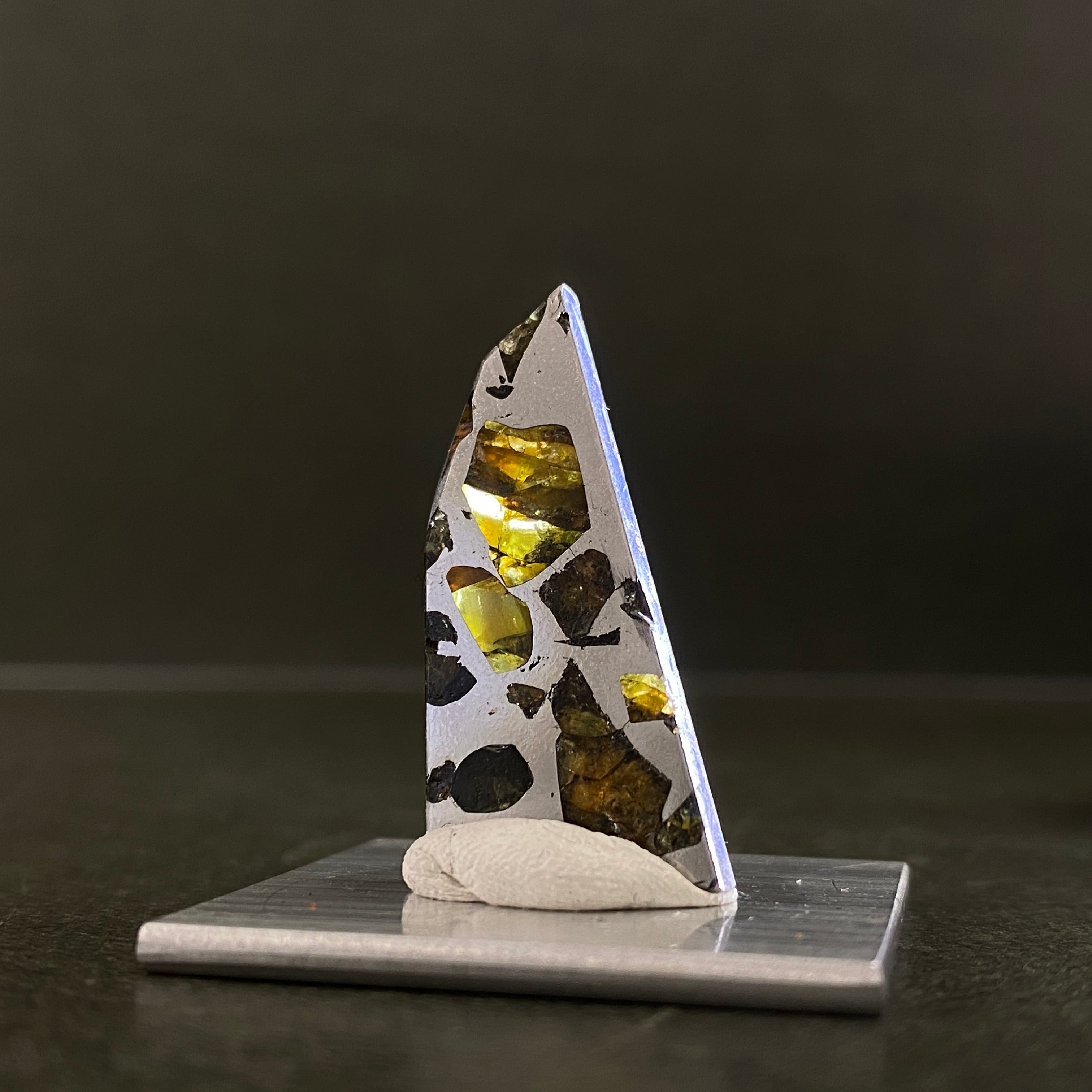 1967年にロシアで発見された隕石です。回収される隕石の中で約1%ほどしかない石鉄隕石(パラサイト隕石)の一種です。この隕石は部位によって値段が大きく変わります。パラサイト隕石の特徴であるカンラン石が満遍なく表現され、かつ、鉄部分とのバランスが美しい個体はとても高価で取引されています。エスケル隕石のように綺麗で透明度の高いオリーブ色のカンラン石があり、人気を高めています。また、鉄部分だけの個体もあります。カット方法によって鉄隕石、パラサイト隕石に区別される珍しい隕石で、とてもサビにくい隕石です。