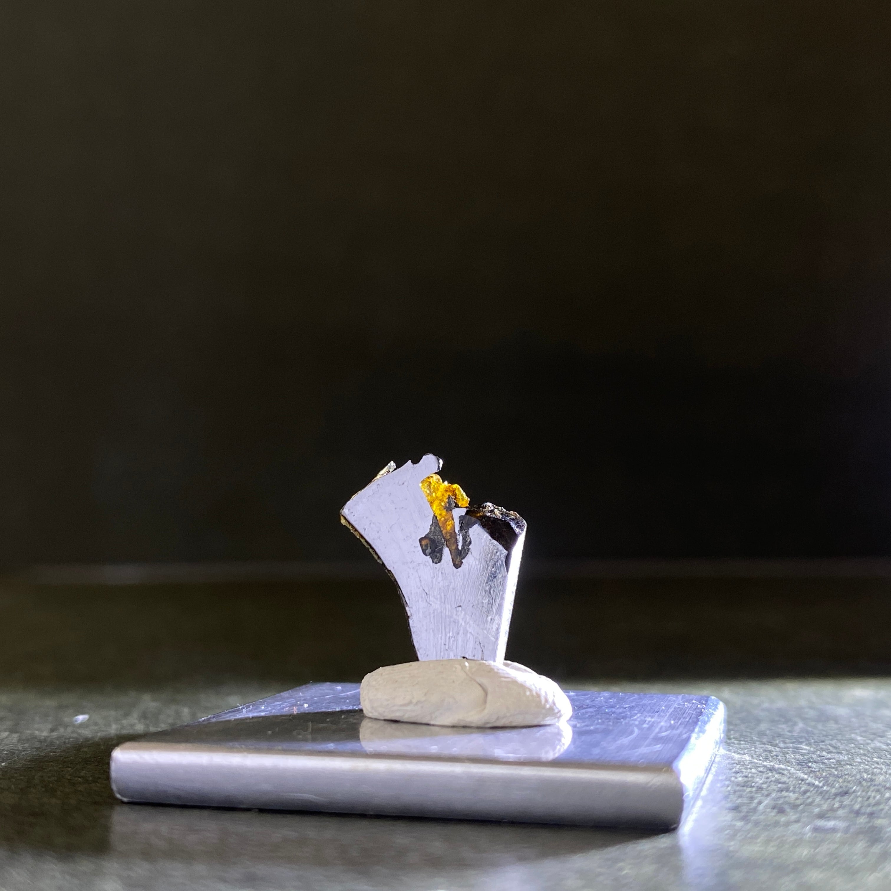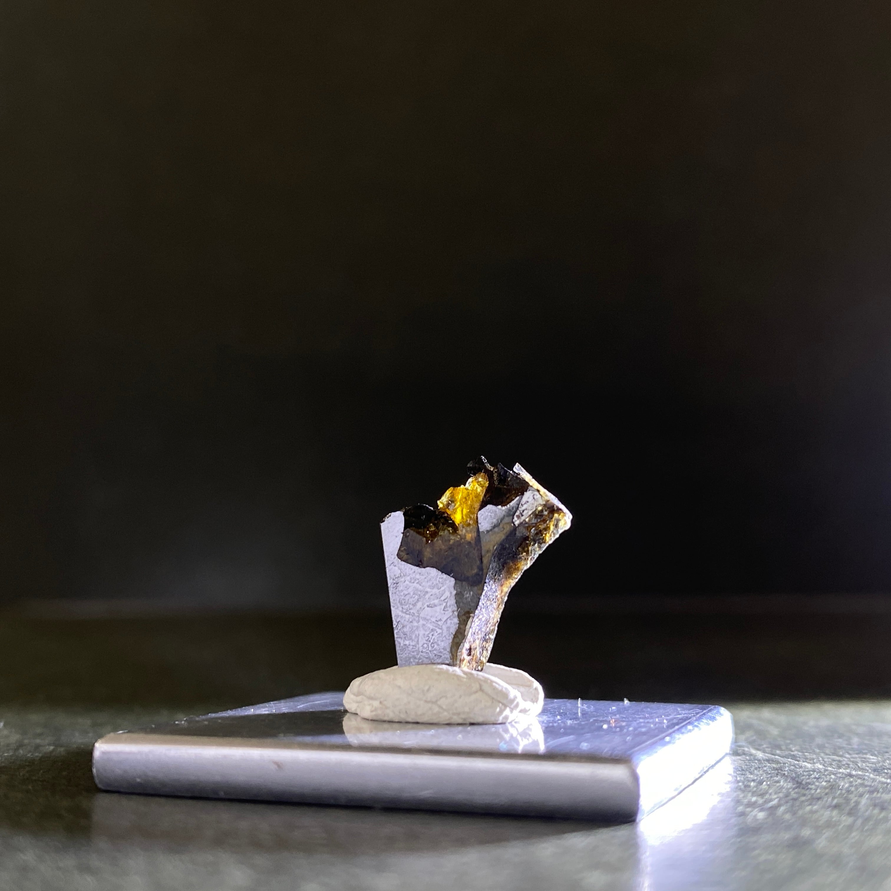 2000年に中国で発見されたパラサイト隕石です。総回収量は約1トンで、市場流通量が極めて少ない入手困難な隕石です。カンラン石の透明度が高く、オレンジ〜イエローの多彩な色味があります。イミラックやエスケルに並ぶ高級隕石です。
