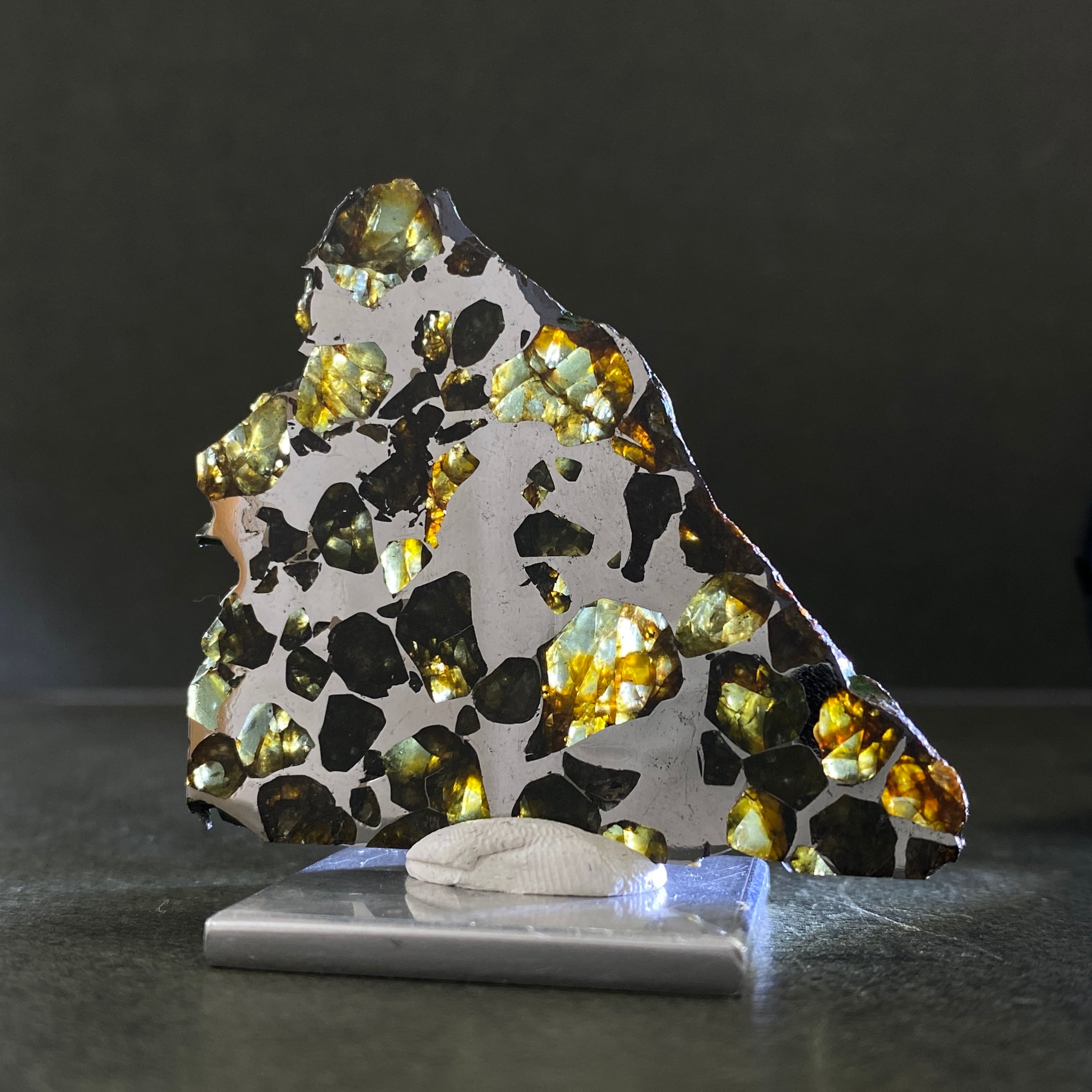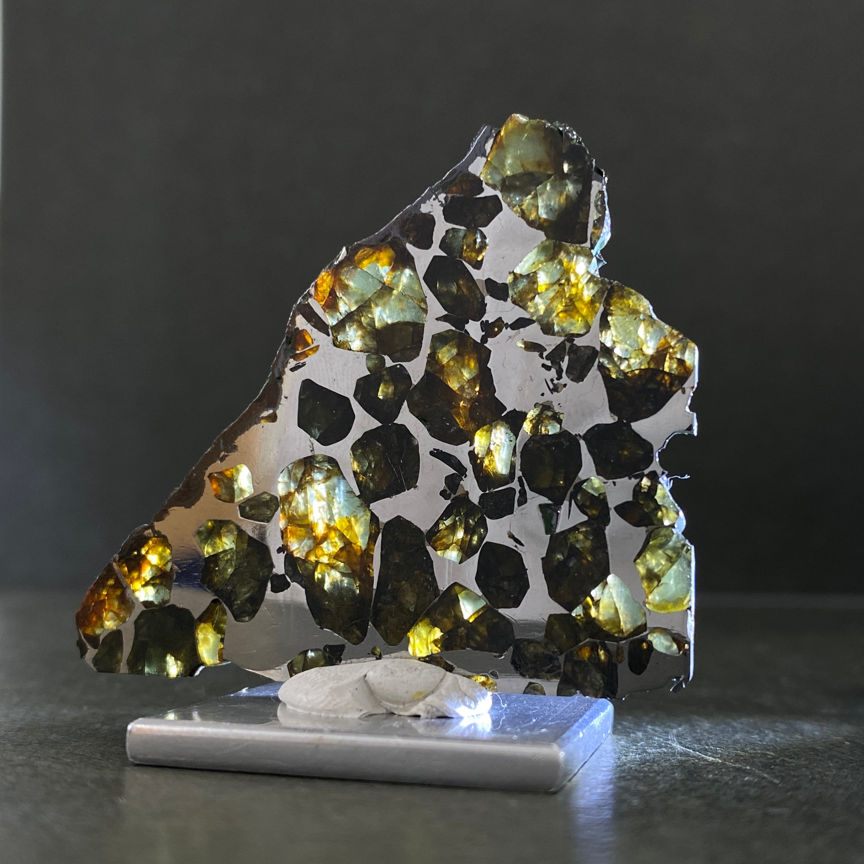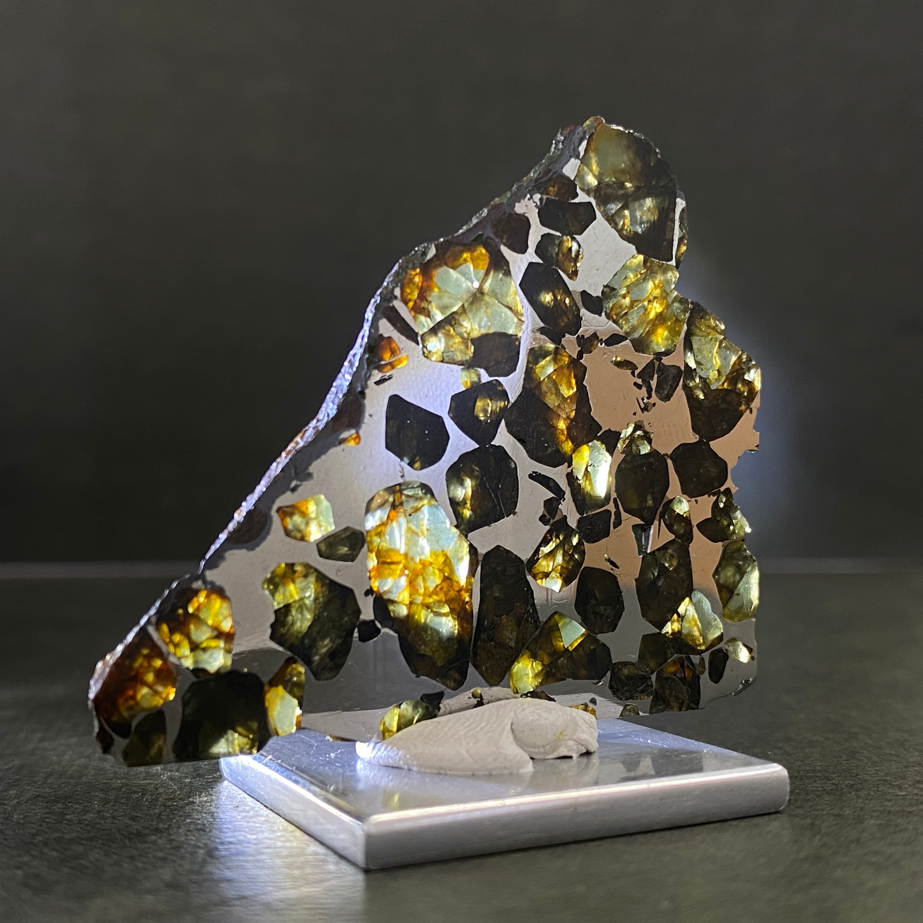1967年にロシアで発見された隕石です。回収される隕石の中で約1%ほどしかない石鉄隕石(パラサイト隕石)の一種です。この隕石は部位によって値段が大きく変わります。パラサイト隕石の特徴であるカンラン石が満遍なく表現され、かつ、鉄部分とのバランスが美しい個体はとても高価で取引されています。エスケル隕石のように綺麗で透明度の高いオリーブ色のカンラン石があり、人気を高めています。また、鉄部分だけの個体もあります。カット方法によって鉄隕石、パラサイト隕石に区別される珍しい隕石で、とてもサビにくい隕石です。