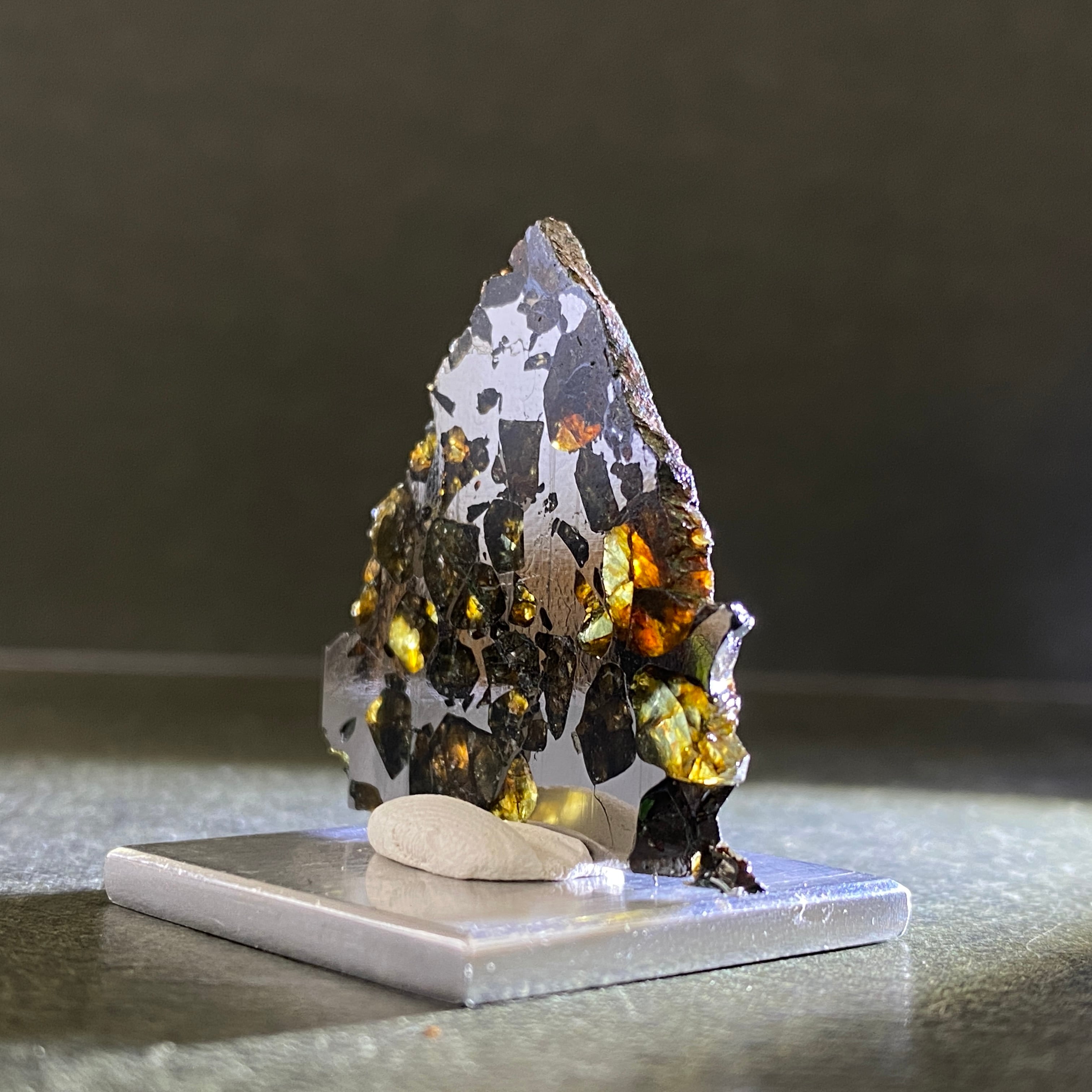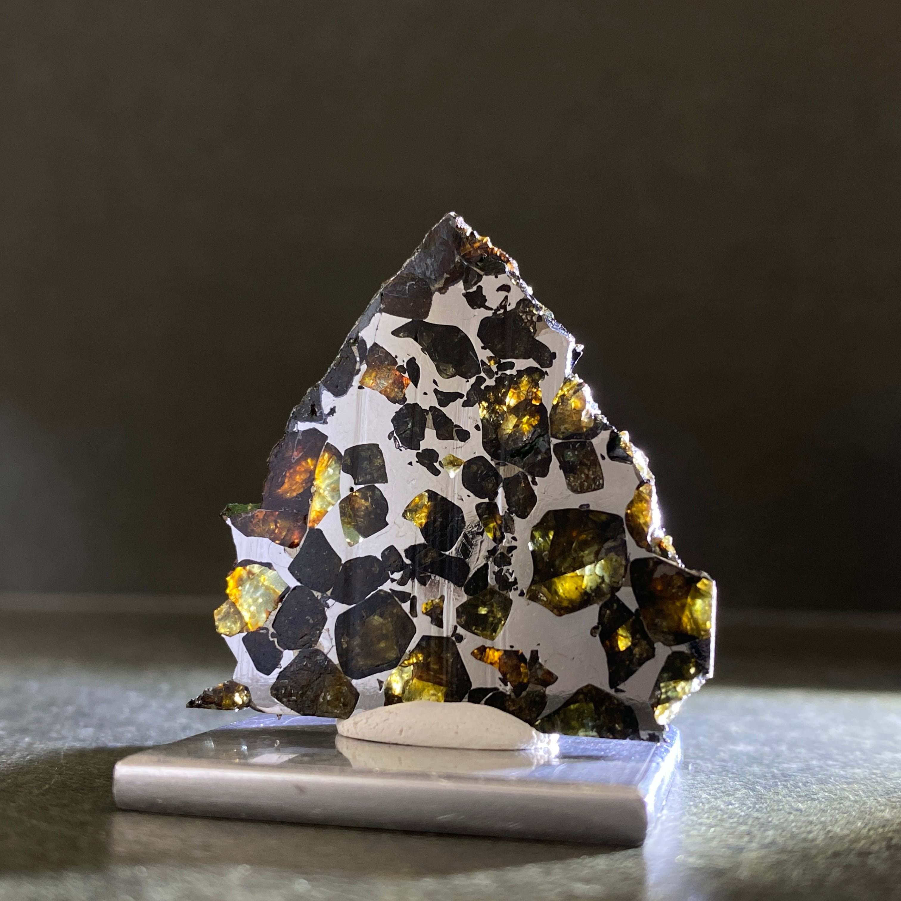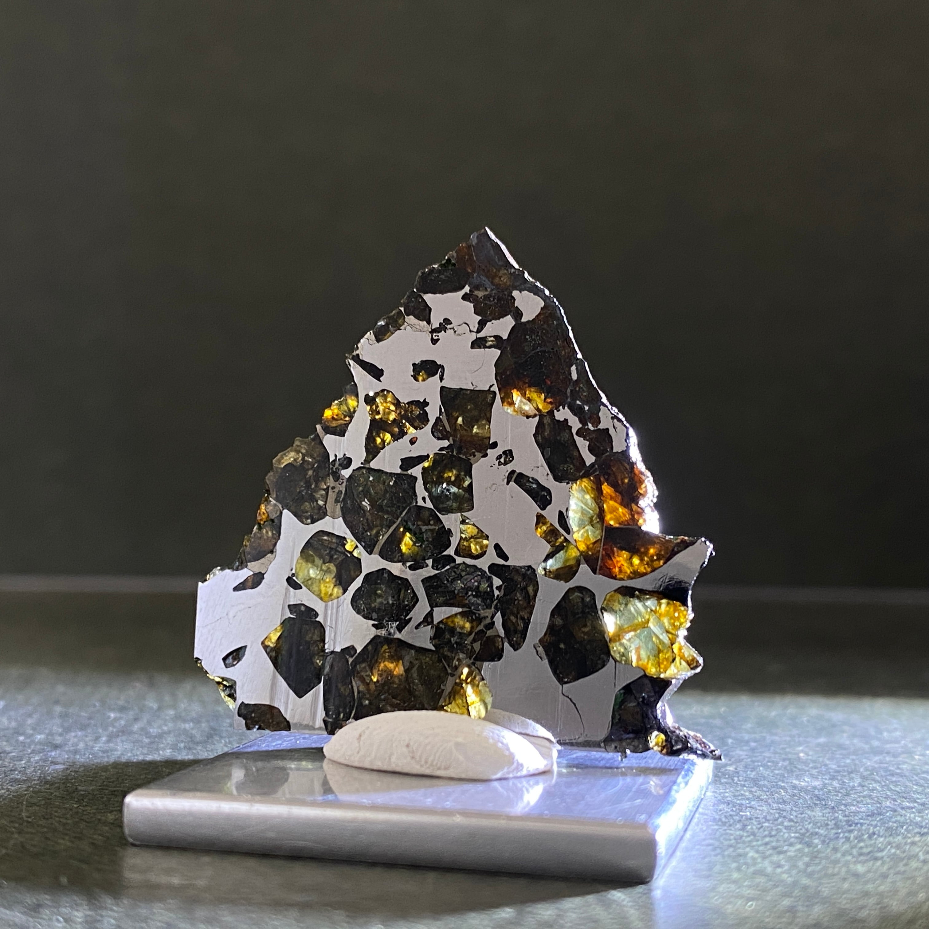 1967年にロシアで発見された隕石です。回収される隕石の中で約1%ほどしかない石鉄隕石(パラサイト隕石)の一種です。この隕石は部位によって値段が大きく変わります。パラサイト隕石の特徴であるカンラン石が満遍なく表現され、かつ、鉄部分とのバランスが美しい個体はとても高価で取引されています。エスケル隕石のように綺麗で透明度の高いオリーブ色のカンラン石があり、人気を高めています。また、鉄部分だけの個体もあります。カット方法によって鉄隕石、パラサイト隕石に区別される珍しい隕石で、とてもサビにくい隕石です。