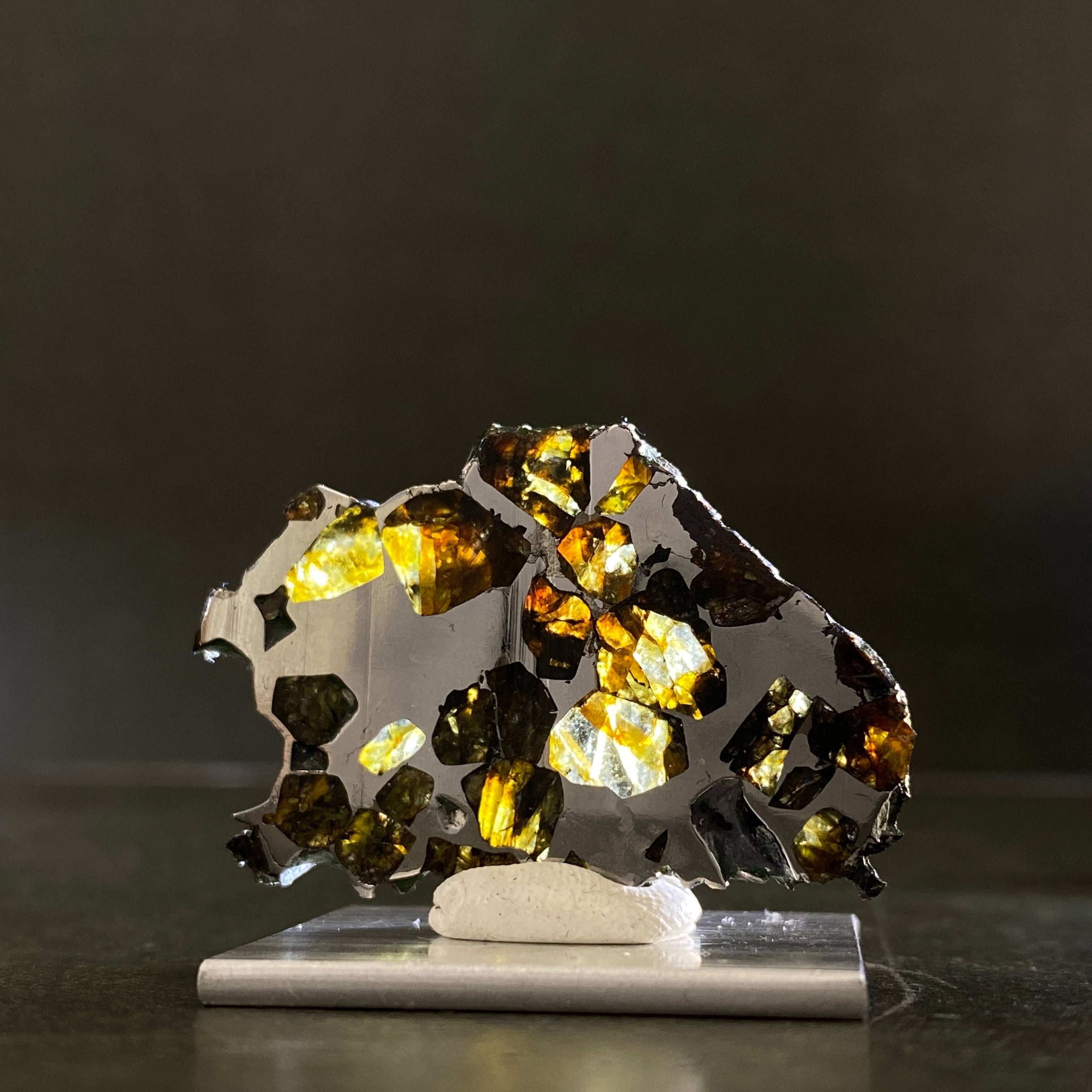 1967年にロシアで発見された隕石です。回収される隕石の中で約1%ほどしかない石鉄隕石(パラサイト隕石)の一種です。この隕石は部位によって値段が大きく変わります。パラサイト隕石の特徴であるカンラン石が満遍なく表現され、かつ、鉄部分とのバランスが美しい個体はとても高価で取引されています。エスケル隕石のように綺麗で透明度の高いオリーブ色のカンラン石があり、人気を高めています。また、鉄部分だけの個体もあります。カット方法によって鉄隕石、パラサイト隕石に区別される珍しい隕石で、とてもサビにくい隕石です。