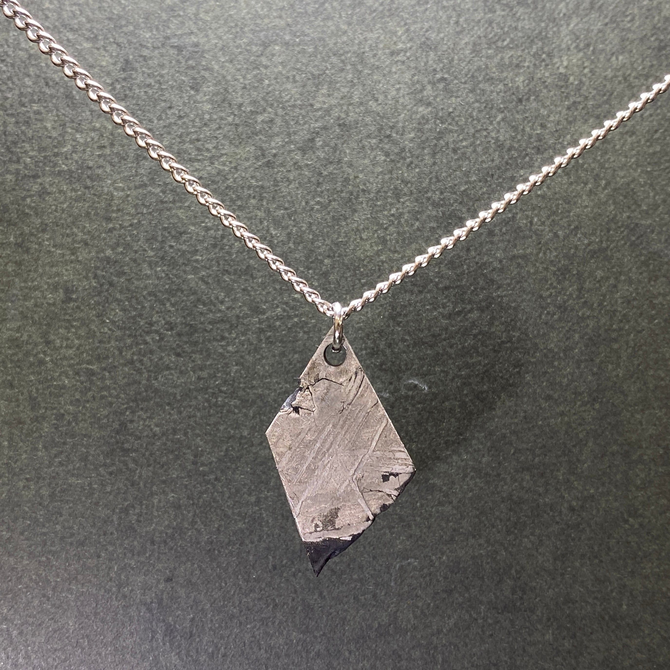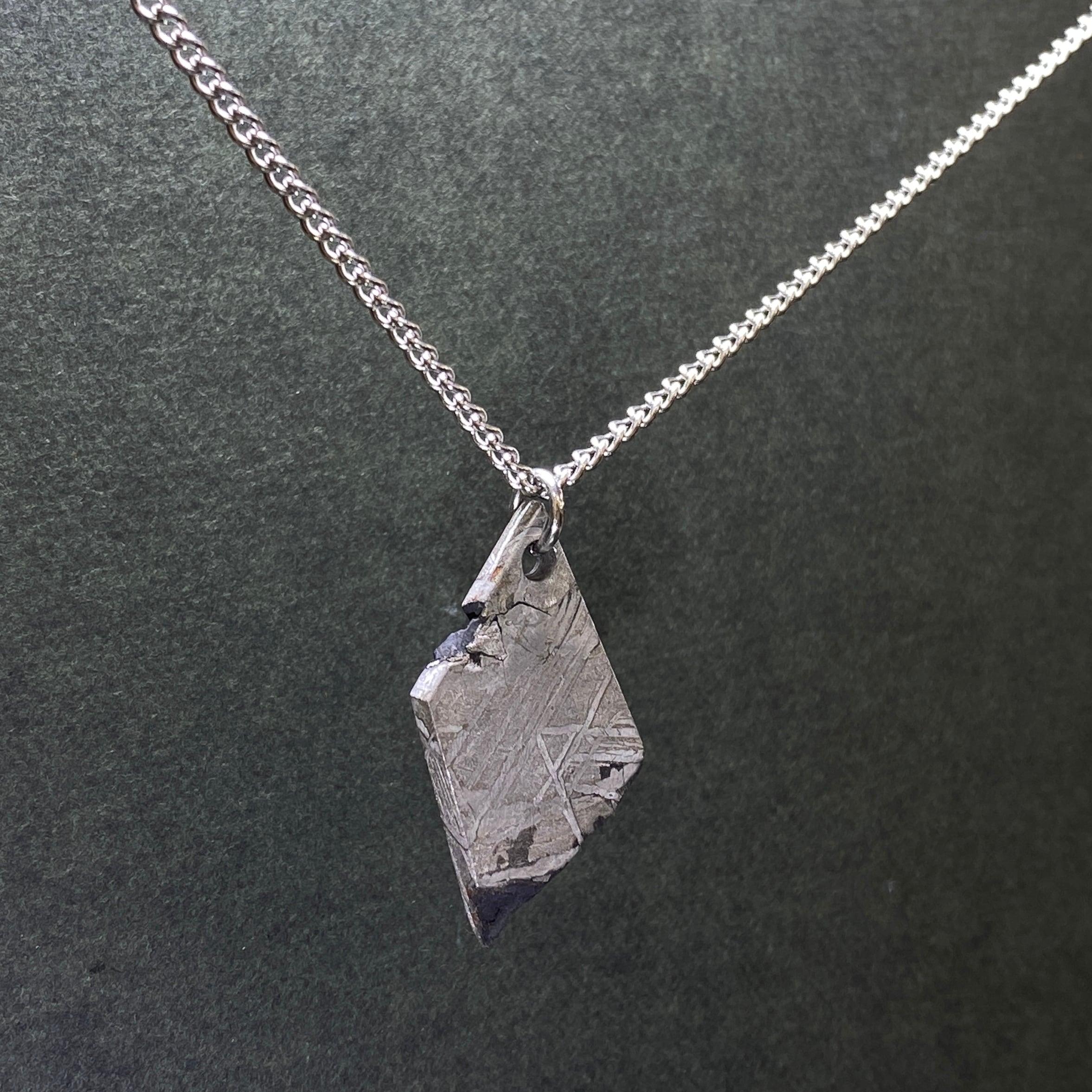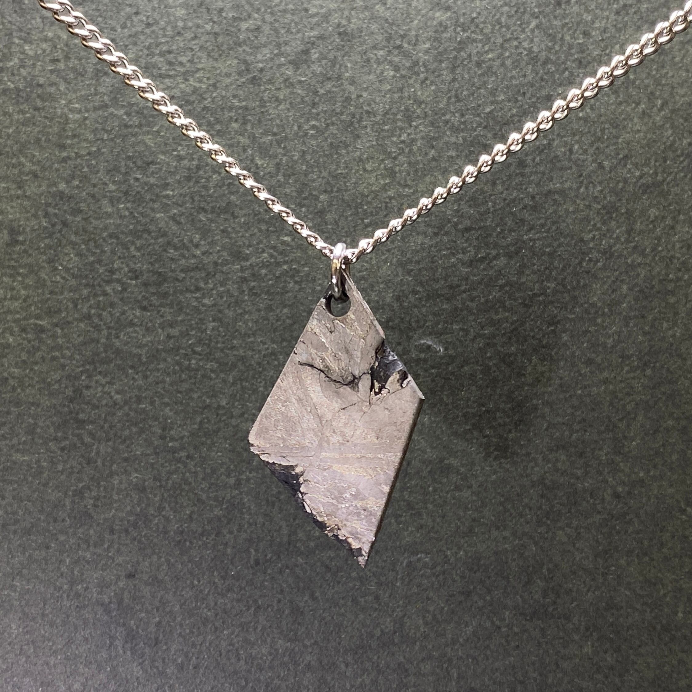 1968年にフランスで発見された隕石です。珍しいヨーロッパの鉄隕石で、シャンパンやワインに使われるぶどう畑で回収されました。サントーバン隕石の特徴はなんといっても特別な切断面です。独特なウィドマンシュテッテン構造にトロイライトの小結晶、そして異常なまでに大きいシュライバーサイトが見られます。局所的にサビが出るのも特徴的で、ウィドマンシュテッテン構造に沿って四角く出るのはこの隕石だけです。側面に多いトロイライトも同様に四角くなっています。どんな隕石とも似つかない特別な隕石であることは間違いありません。