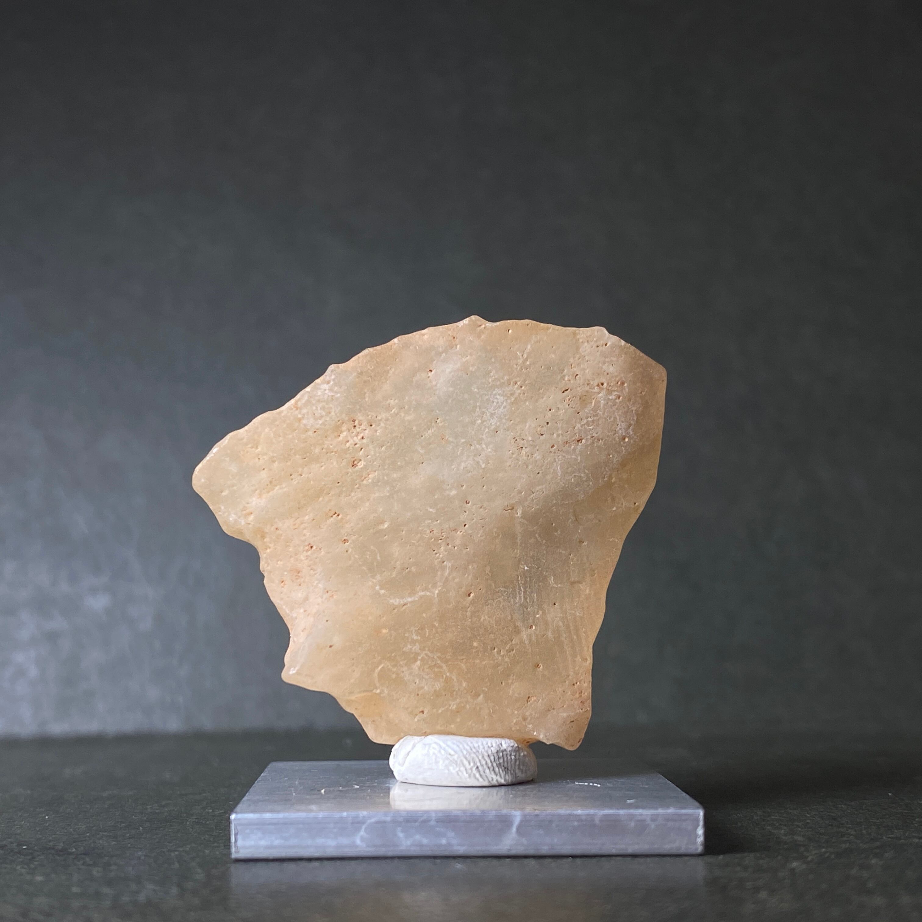 2600万年前のエジプトとのリビア国境近くでの大規模な隕石の衝撃によって形成されたインパクトガラスです。天然ガラスとも言われ、約98%の最も純粋なガラスだそうです。リビアングラスには、クリストバル石(クリストバライト)と呼ばれる白い気泡のような内包物があります。これは高温で形成された珪質の物質です。諸説ありますが、リビア東部とエジプト西部の砂漠には、1000トン以上のリビアンが散らばっていると言われています。その多くは小さいサイズですが、今まで発見された中で1番大きいリビアンは約26kgです。新石器時代、当時の人はリビアンを使ってガラスの道具を作り、後にエジプト人はそれらを使って宝石を作りました。ちなみに、エジプトにあるミラミッドのツタンカーメンの胸当てにちりばめられた石は、リビアングラスで作られています。