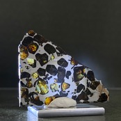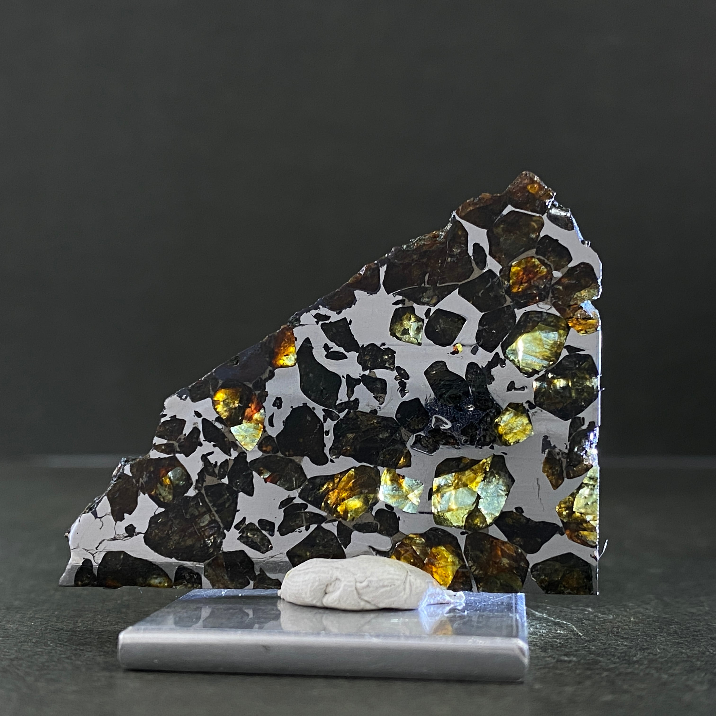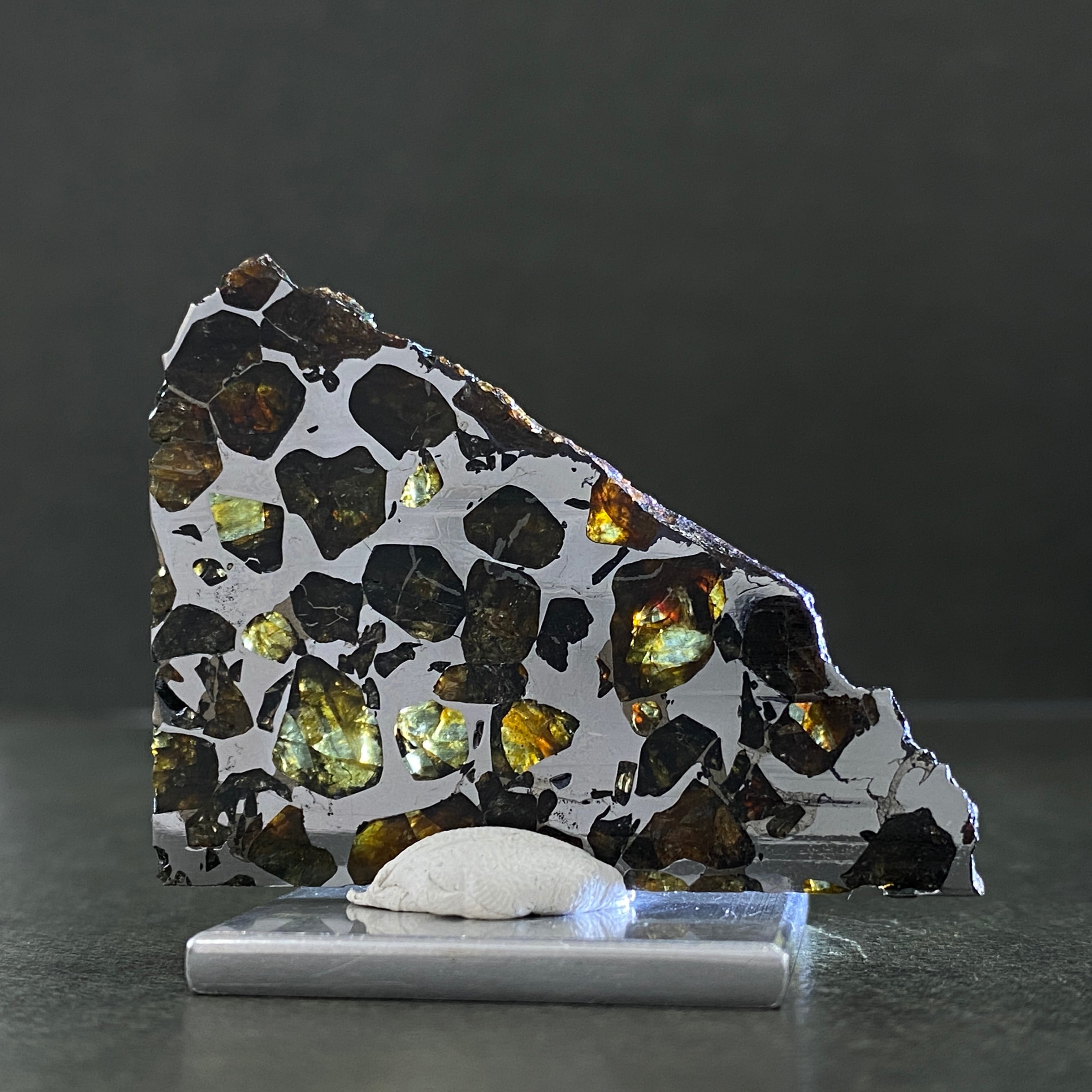 1967年にロシアで発見された隕石です。回収される隕石の中で約1%ほどしかない石鉄隕石(パラサイト隕石)の一種です。この隕石は部位によって値段が大きく変わります。パラサイト隕石の特徴であるカンラン石が満遍なく表現され、かつ、鉄部分とのバランスが美しい個体はとても高価で取引されています。エスケル隕石のように綺麗で透明度の高いオリーブ色のカンラン石があり、人気を高めています。また、鉄部分だけの個体もあります。カット方法によって鉄隕石、パラサイト隕石に区別される珍しい隕石で、とてもサビにくい隕石です。