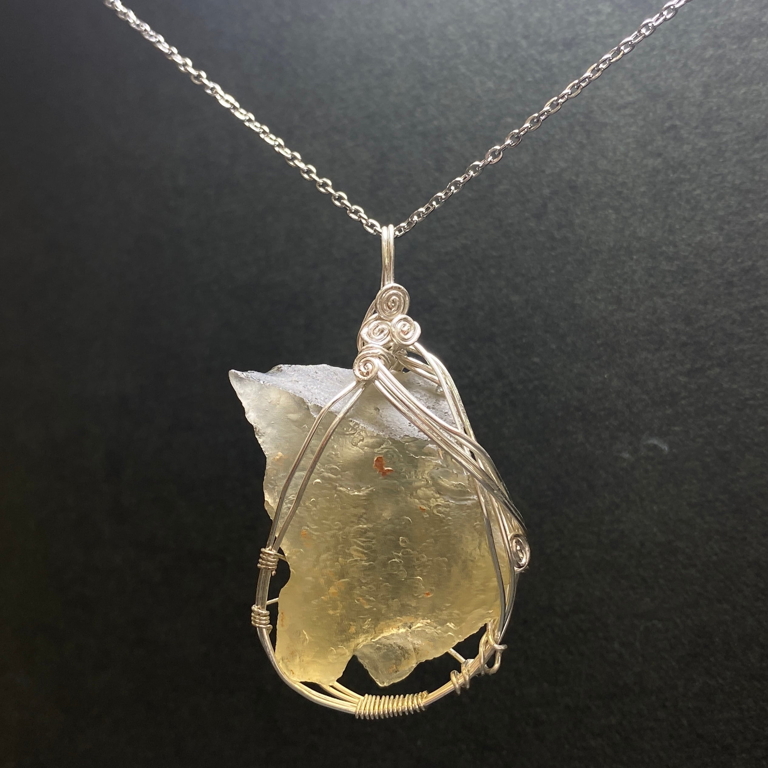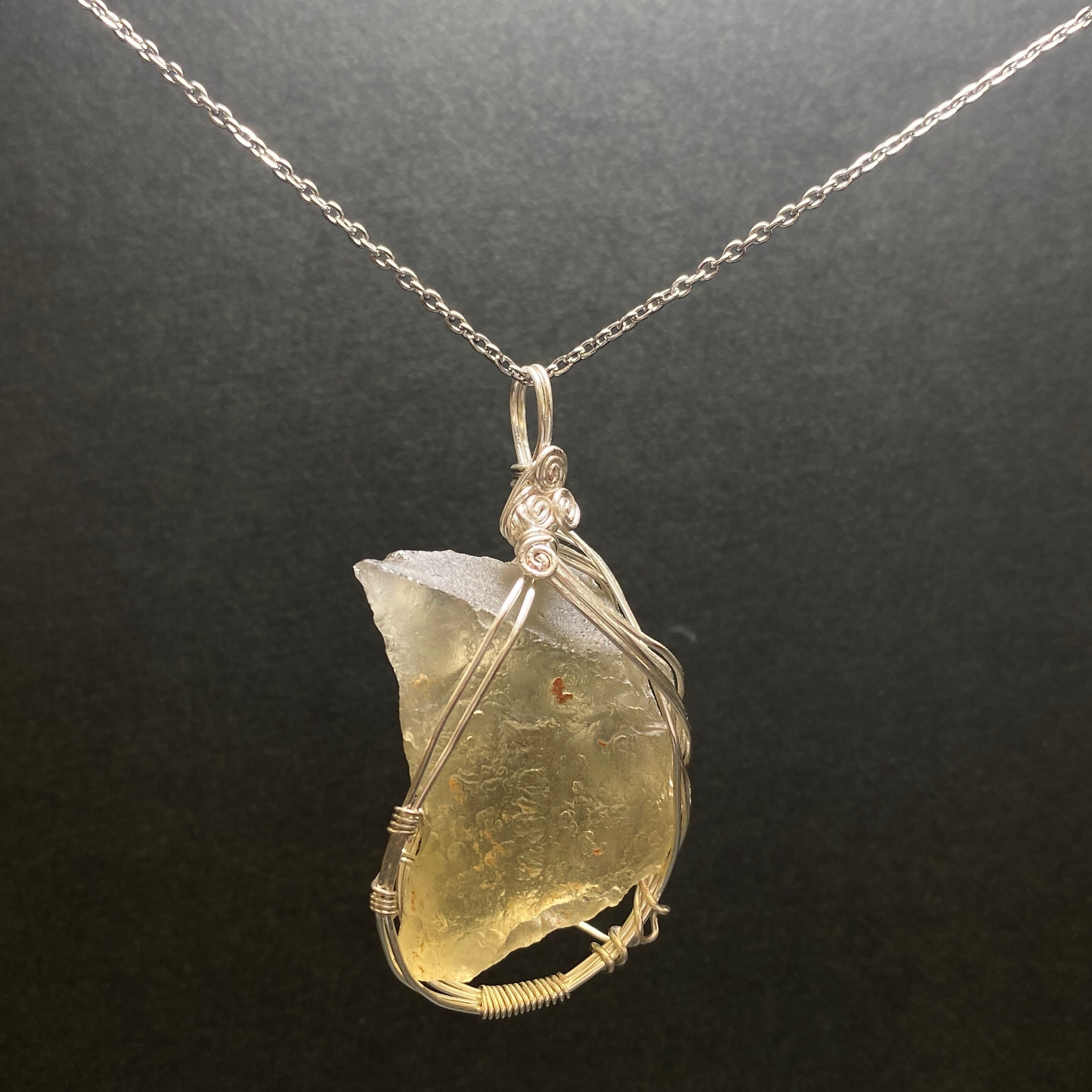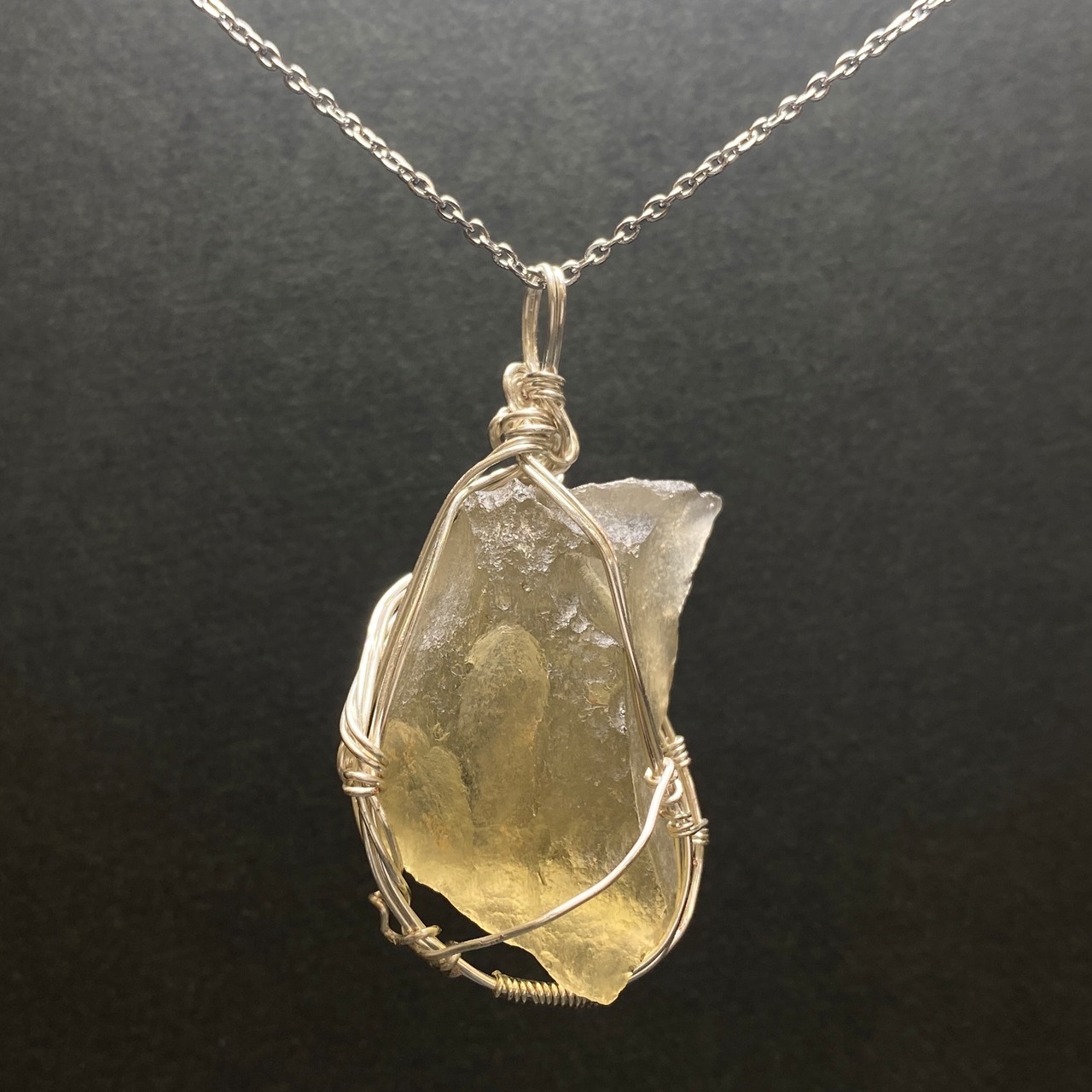 2600万年前のエジプトとのリビア国境近くでの大規模な隕石の衝撃によって形成されたインパクトガラスです。天然ガラスとも言われ、約98%の最も純粋なガラスだそうです。リビアングラスには、クリストバル石(クリストバライト)と呼ばれる白い気泡のような内包物があります。これは高温で形成された珪質の物質です。諸説ありますが、リビア東部とエジプト西部の砂漠には、1000トン以上のリビアンが散らばっていると言われています。その多くは小さいサイズですが、今まで発見された中で1番大きいリビアンは約26kgです。新石器時代、当時の人はリビアンを使ってガラスの道具を作り、後にエジプト人はそれらを使って宝石を作りました。ちなみに、エジプトにあるミラミッドのツタンカーメンの胸当てにちりばめられた石は、リビアングラスで作られています。