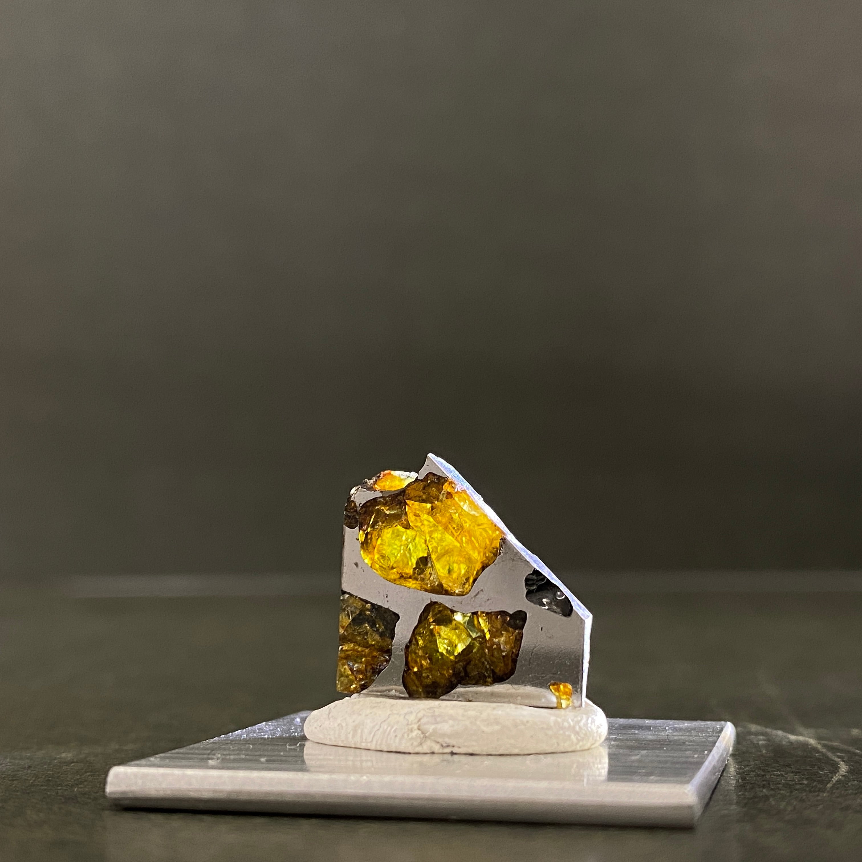 1822年にチリで発見された隕石です。パラサイト隕石自体の回収量は全体の約1%で希少なのですが、イミラックはその中でも希少かつ人気の隕石です。そのカンラン石は大きく、透明度が高いです。イエローグリーンに輝くその様は、宇宙の宝石と呼ばれるほどです。サビにくさも人気の1つです。美しいそのフォルムを美しいまま、いつまでの楽しめる隕石です。