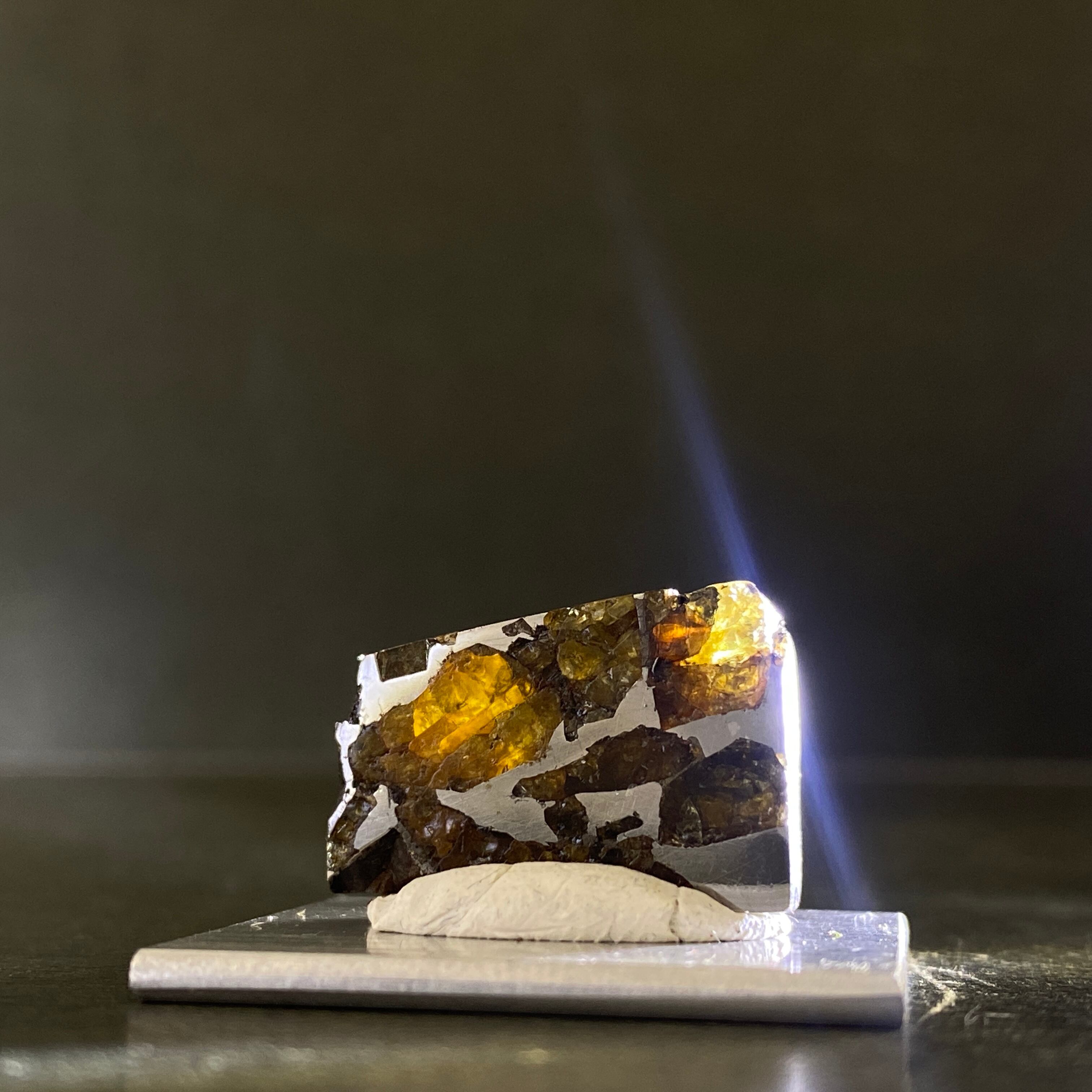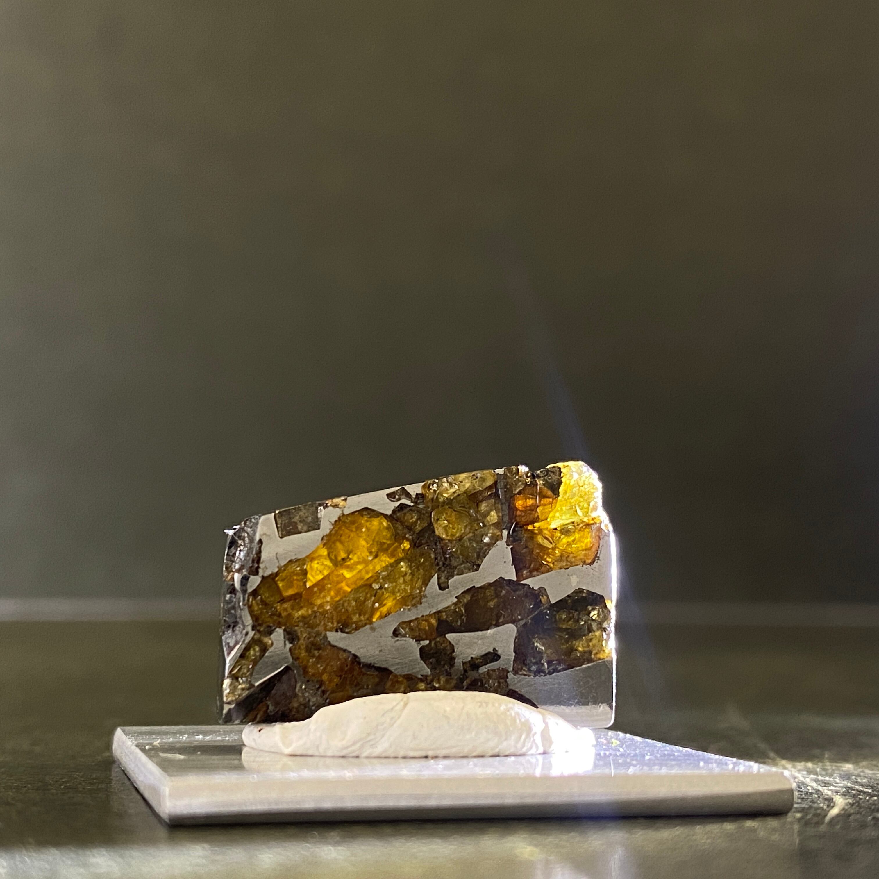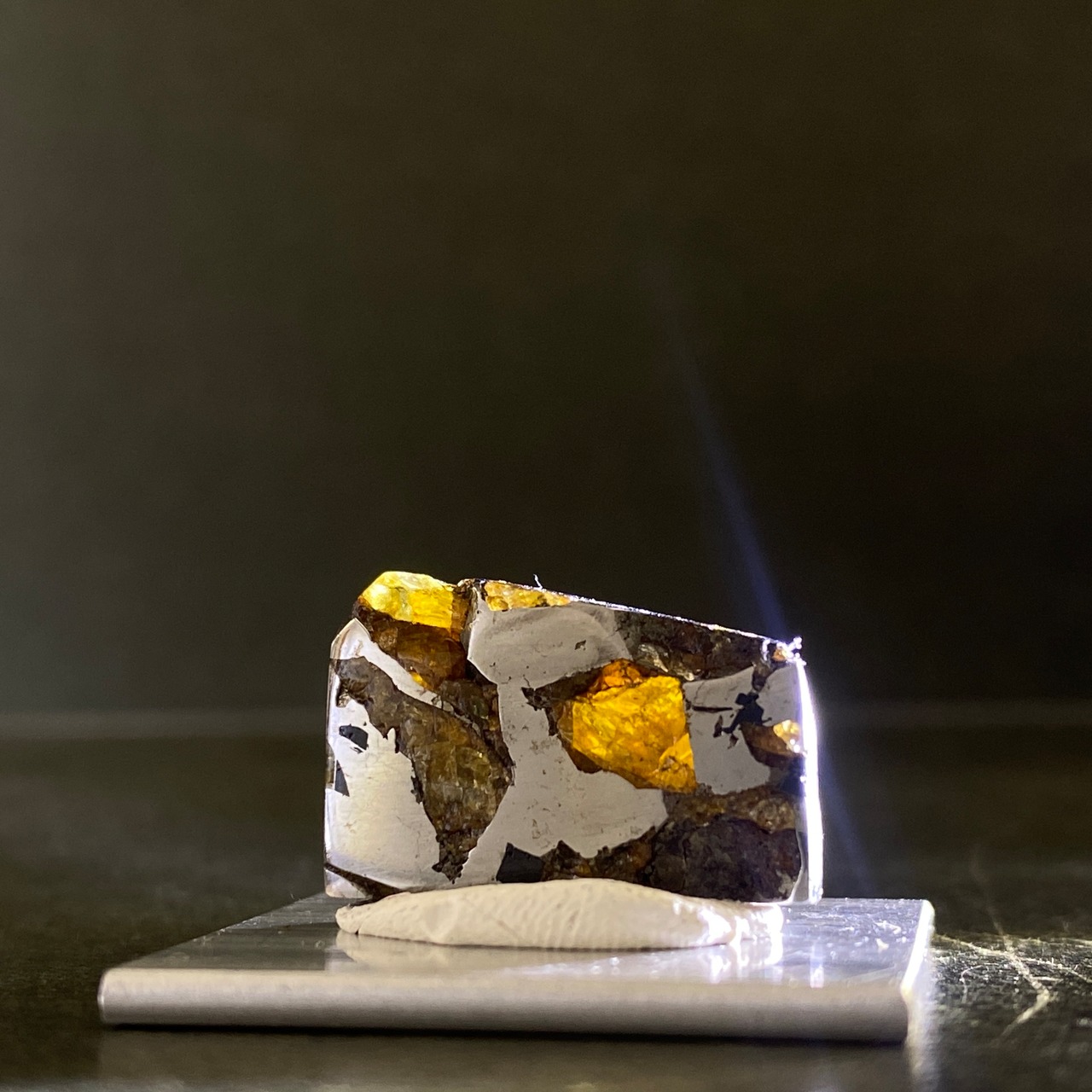 1810年にベラルーシにて発見された隕石です。諸説ありますが、分裂した小惑星のコアマントルの境界線の部分になります。この隕石は地球に落下するまでに別の隕石の衝突によって宇宙空間で粉砕されたようです。カンラン石の透明度はパラサイト隕石の中でも透明度が高く、パラサイトペリドットとして宝石などに使われています。