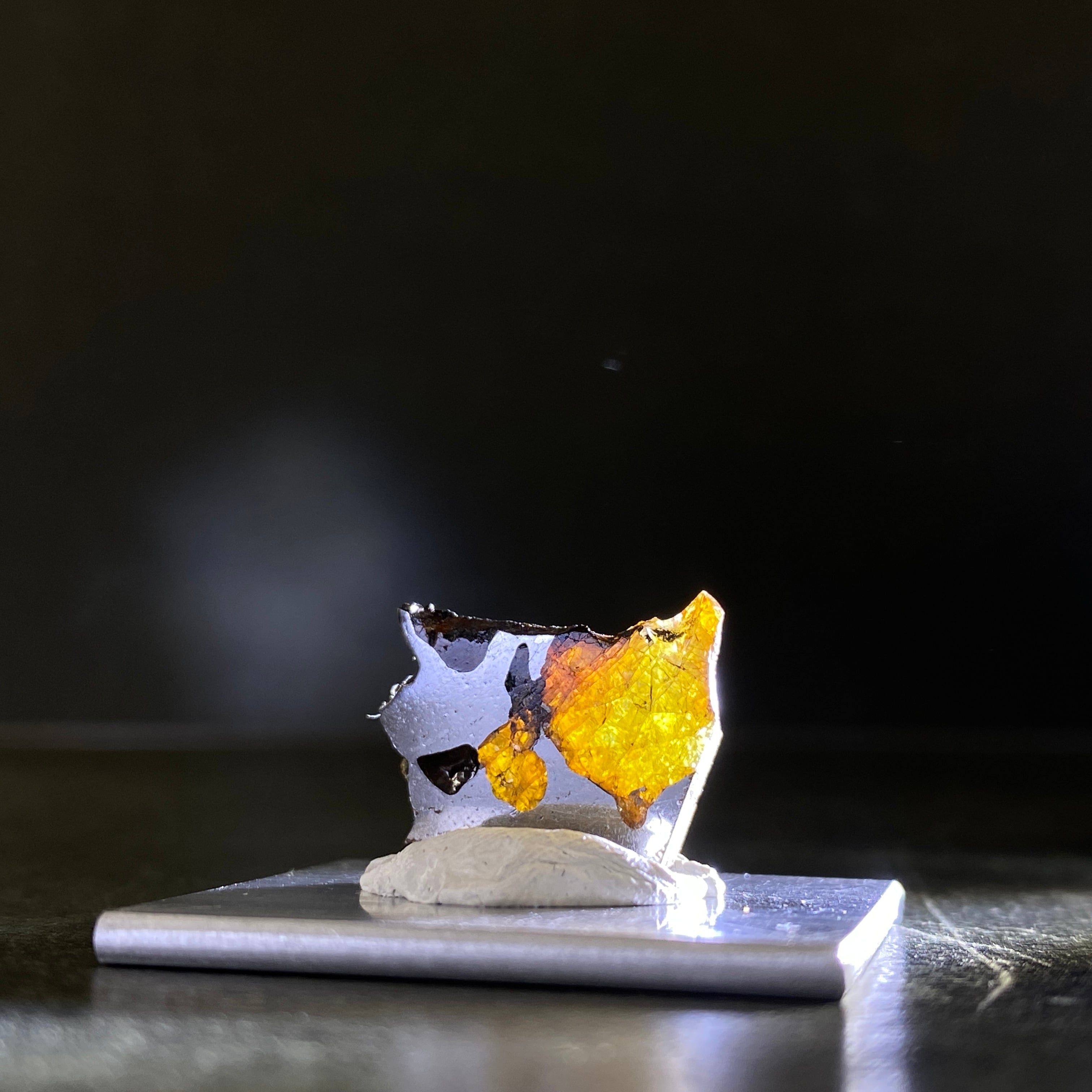 1822年にチリで発見された隕石です。パラサイト隕石自体の回収量は全体の約1%で希少なのですが、イミラックはその中でも希少かつ人気の隕石です。そのカンラン石は大きく、透明度が高いです。イエローグリーンに輝くその様は、宇宙の宝石と呼ばれるほどです。サビにくさも人気の1つです。美しいそのフォルムを美しいまま、いつまでの楽しめる隕石です。