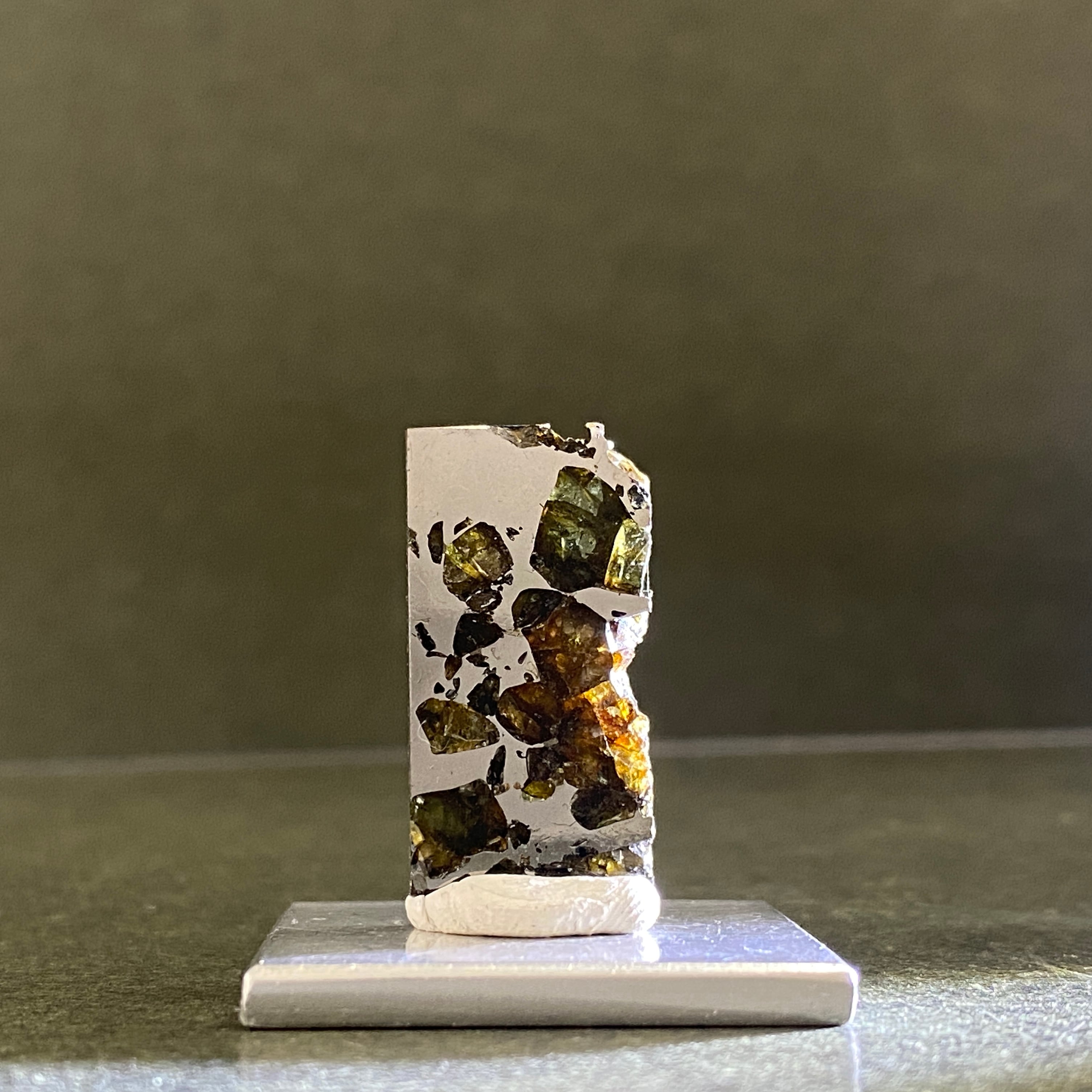 1967年にロシアで発見された隕石です。回収される隕石の中で約1%ほどしかない石鉄隕石(パラサイト隕石)の一種です。この隕石は部位によって値段が大きく変わります。パラサイト隕石の特徴であるカンラン石が満遍なく表現され、かつ、鉄部分とのバランスが美しい個体はとても高価で取引されています。エスケル隕石のように綺麗で透明度の高いオリーブ色のカンラン石があり、人気を高めています。また、鉄部分だけの個体もあります。カット方法によって鉄隕石、パラサイト隕石に区別される珍しい隕石で、とてもサビにくい隕石です。