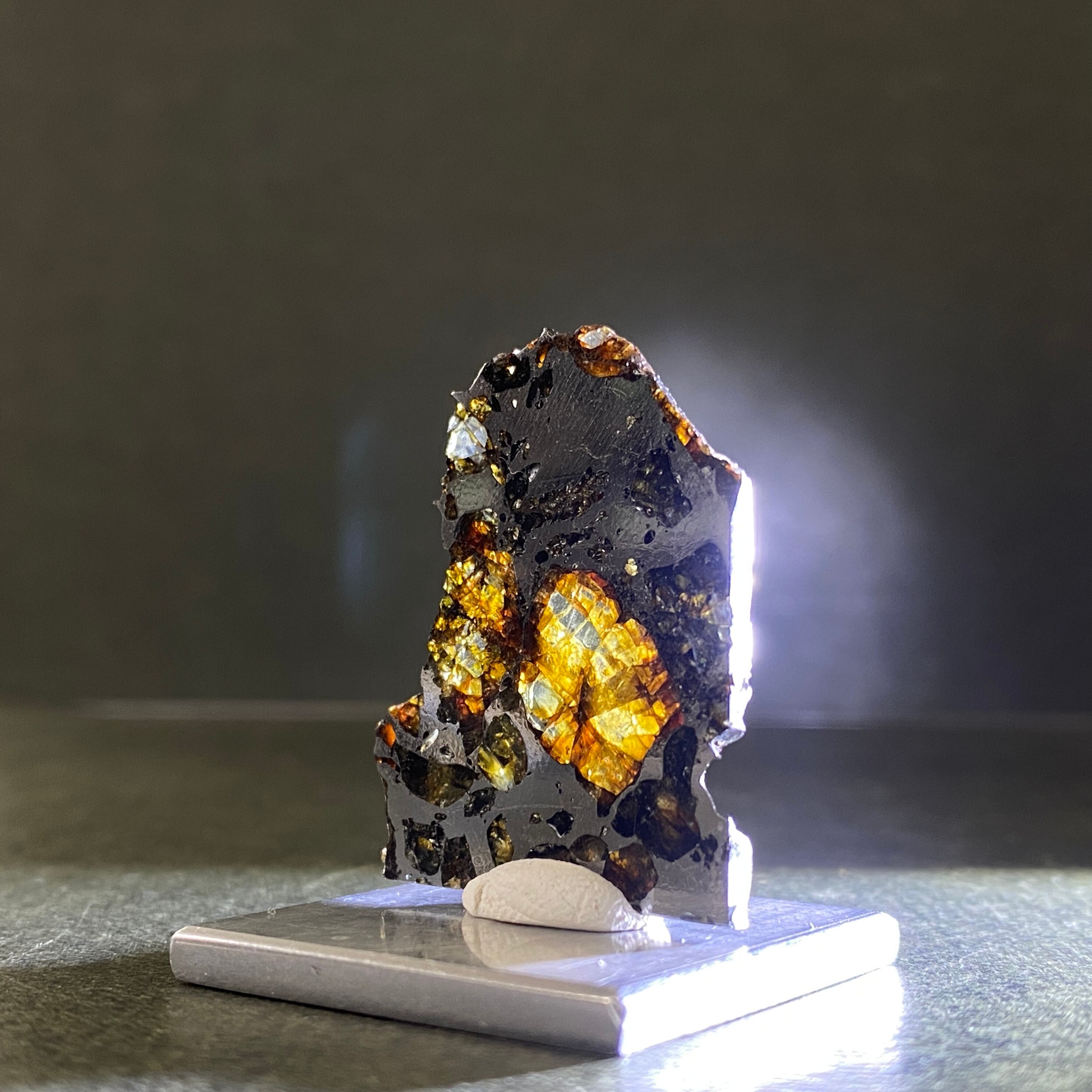 1967年にロシアで発見された隕石です。回収される隕石の中で約1%ほどしかない石鉄隕石(パラサイト隕石)の一種です。この隕石は部位によって値段が大きく変わります。パラサイト隕石の特徴であるカンラン石が満遍なく表現され、かつ、鉄部分とのバランスが美しい個体はとても高価で取引されています。エスケル隕石のように綺麗で透明度の高いオリーブ色のカンラン石があり、人気を高めています。また、鉄部分だけの個体もあります。カット方法によって鉄隕石、パラサイト隕石に区別される珍しい隕石で、とてもサビにくい隕石です。