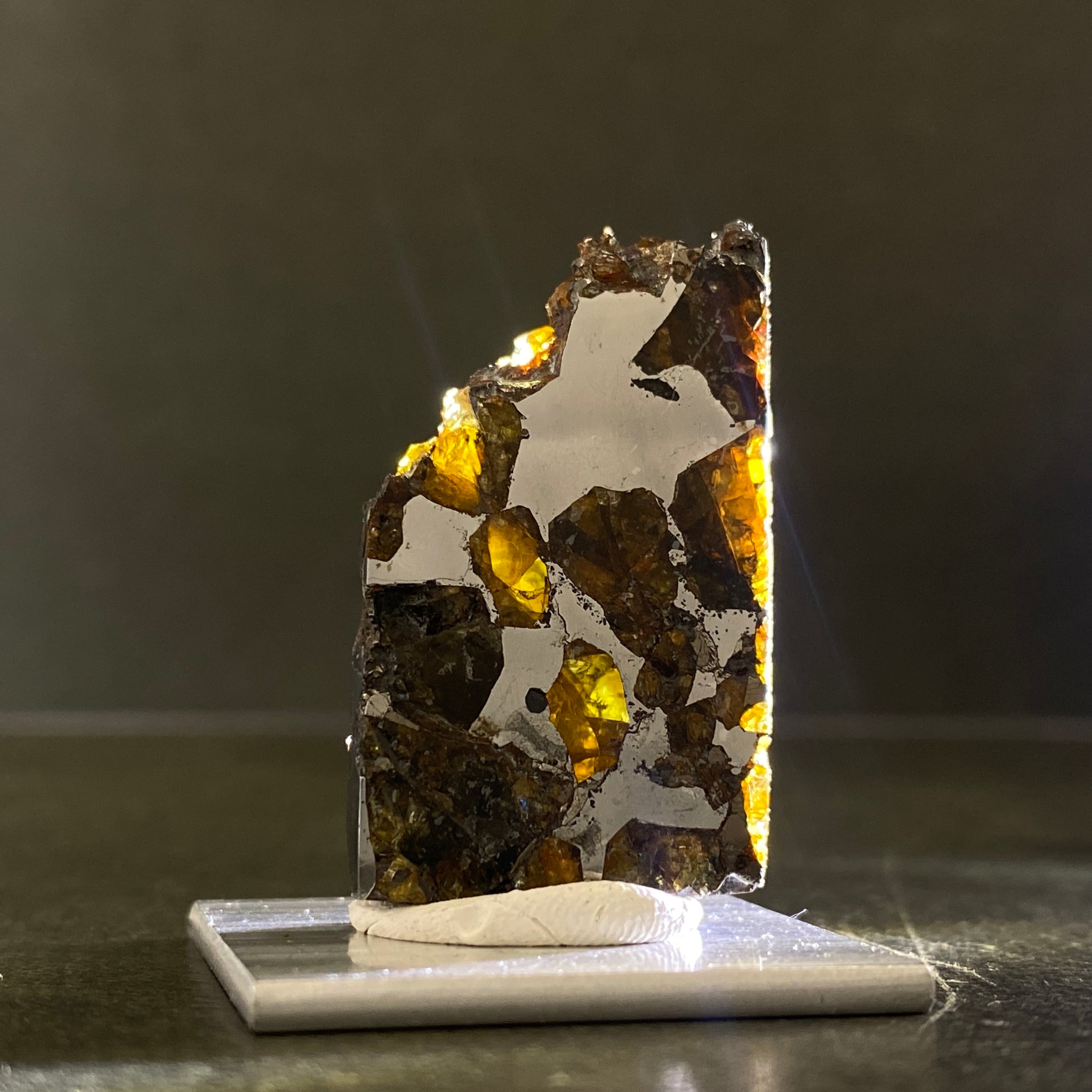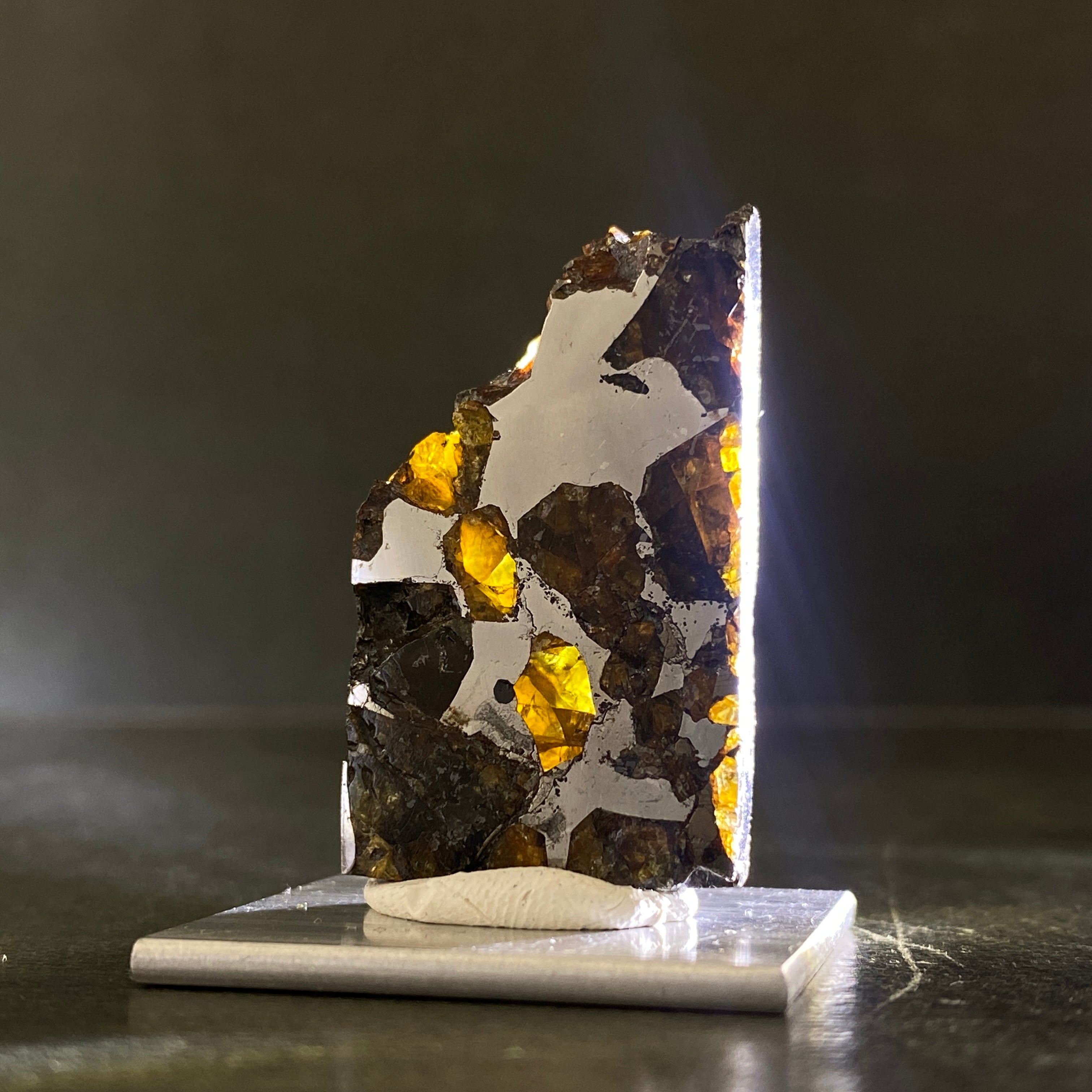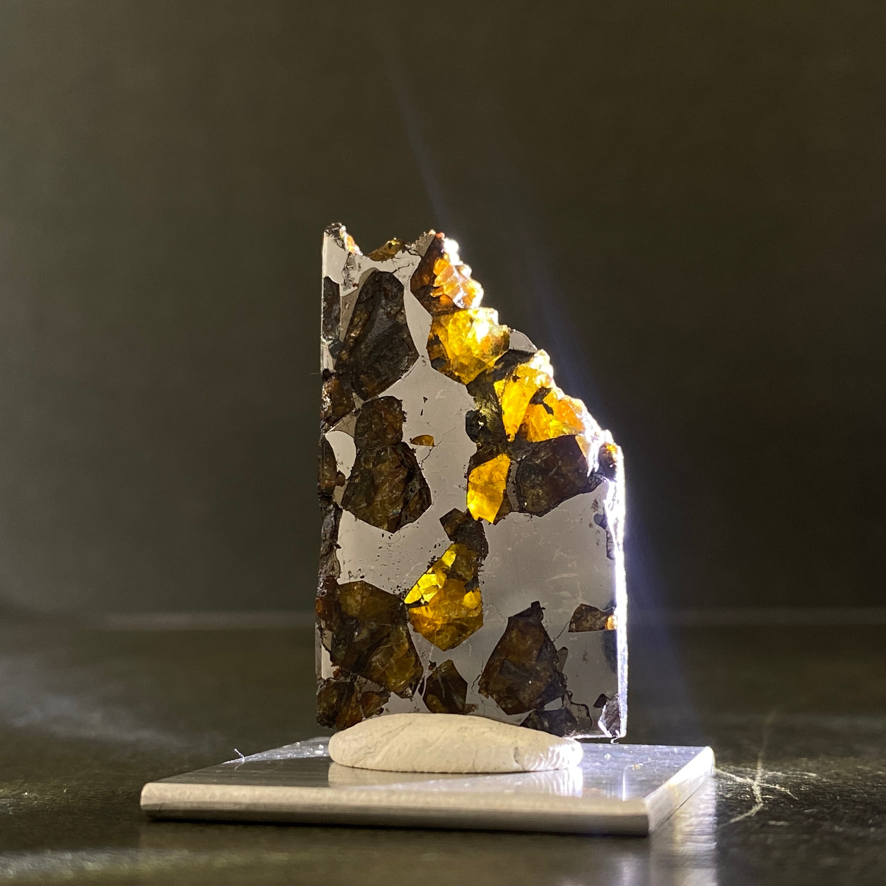 1810年にベラルーシにて発見された隕石です。諸説ありますが、分裂した小惑星のコアマントルの境界線の部分になります。この隕石は地球に落下するまでに別の隕石の衝突によって宇宙空間で粉砕されたようです。カンラン石の透明度はパラサイト隕石の中でも透明度が高く、パラサイトペリドットとして宝石などに使われています。