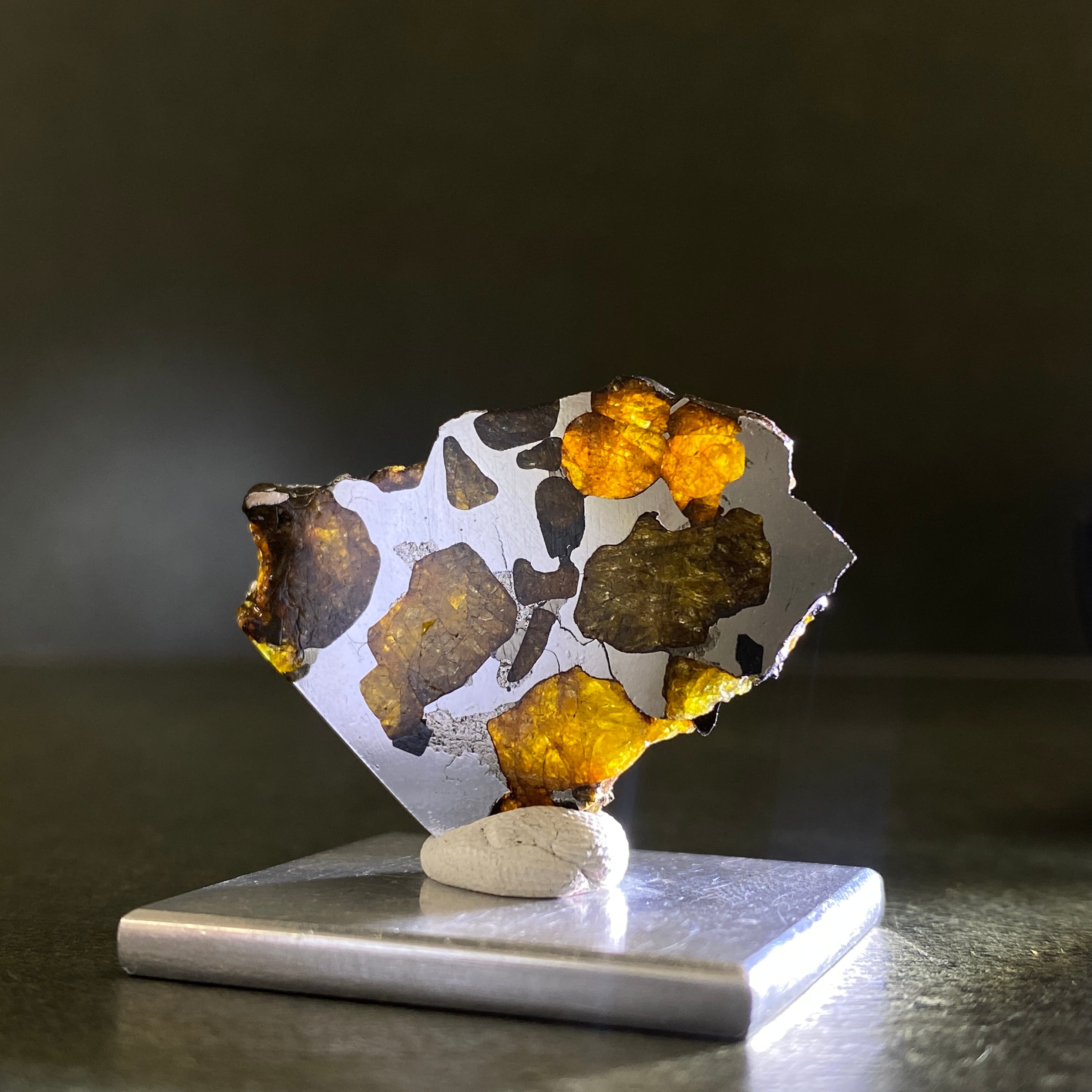 1822年にチリで発見された隕石です。パラサイト隕石自体の回収量は全体の約1%で希少なのですが、イミラックはその中でも希少かつ人気の隕石です。そのカンラン石は大きく、透明度が高いです。イエローグリーンに輝くその様は、宇宙の宝石と呼ばれるほどです。サビにくさも人気の1つです。美しいそのフォルムを美しいまま、いつまでも楽しめる隕石です。