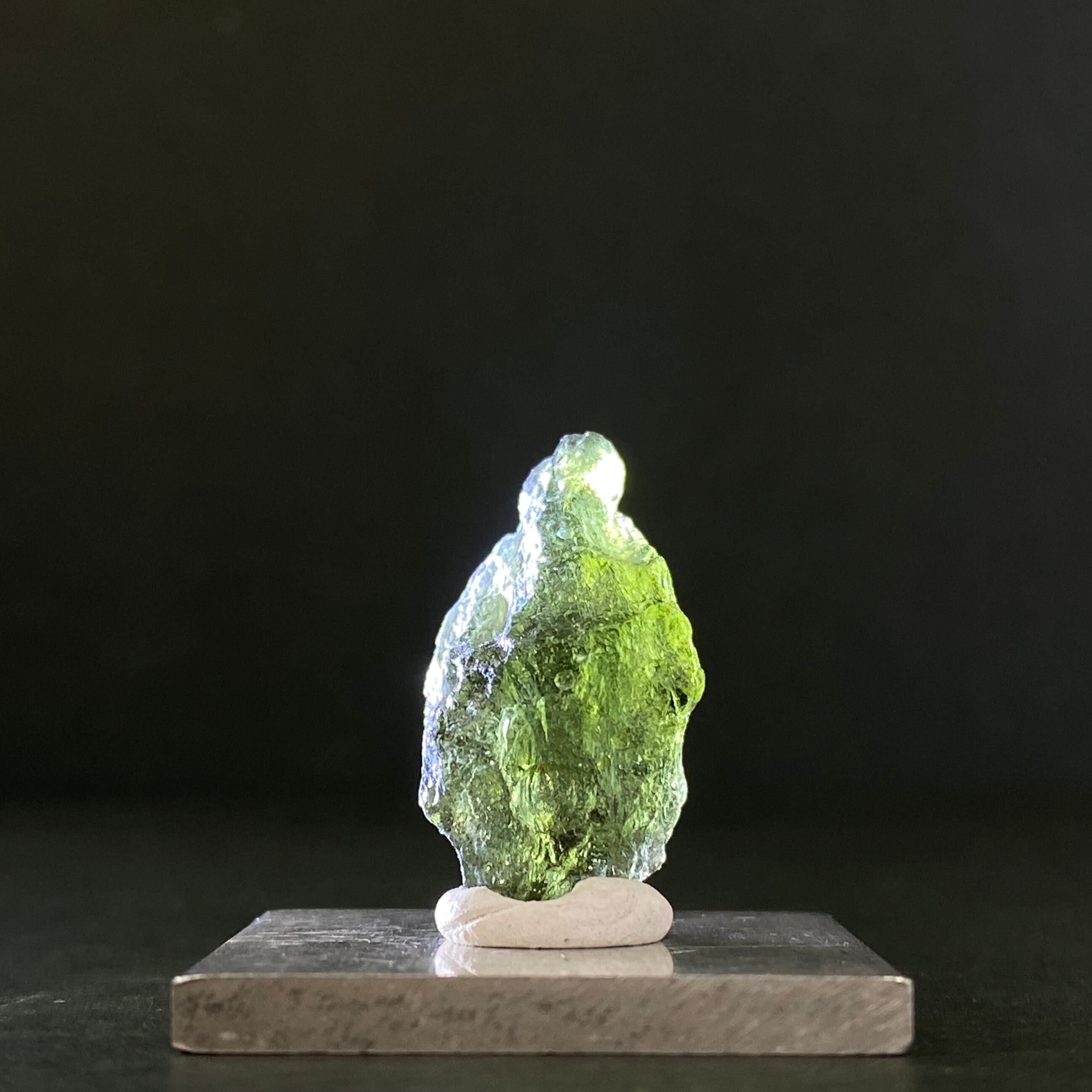 チェコで回収されたインパクトガラスです。近年、高騰し続けている隕石の1つで、形の綺麗なモルダバイトは年々少なくなっております。人気(需要)と在庫(供給)のバランスが崩れており、回収地の本場チェコでも偽物が量産されているほどです。本物のモルダバイトを手にしたいのであれば、安価で販売されているモルダバイトには手を出さないことをオススメします。ビーズのブレスレットや研磨された綺麗なモルダバイトも同様です。モルダバイトを購入する時にはご注意ください。