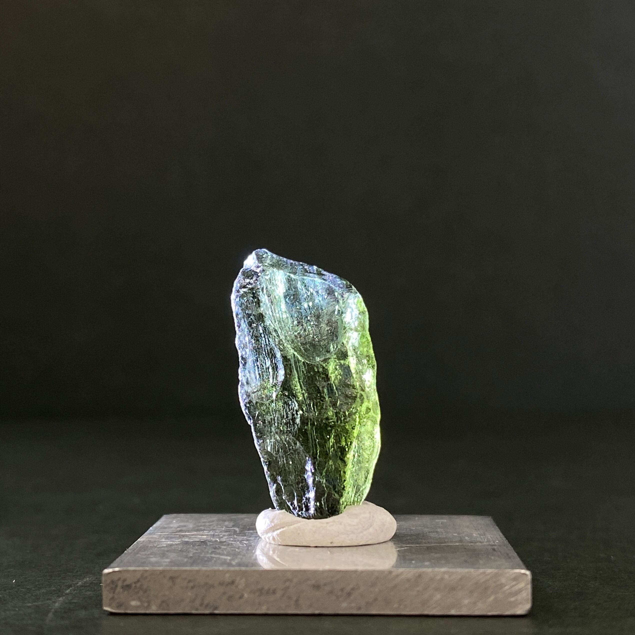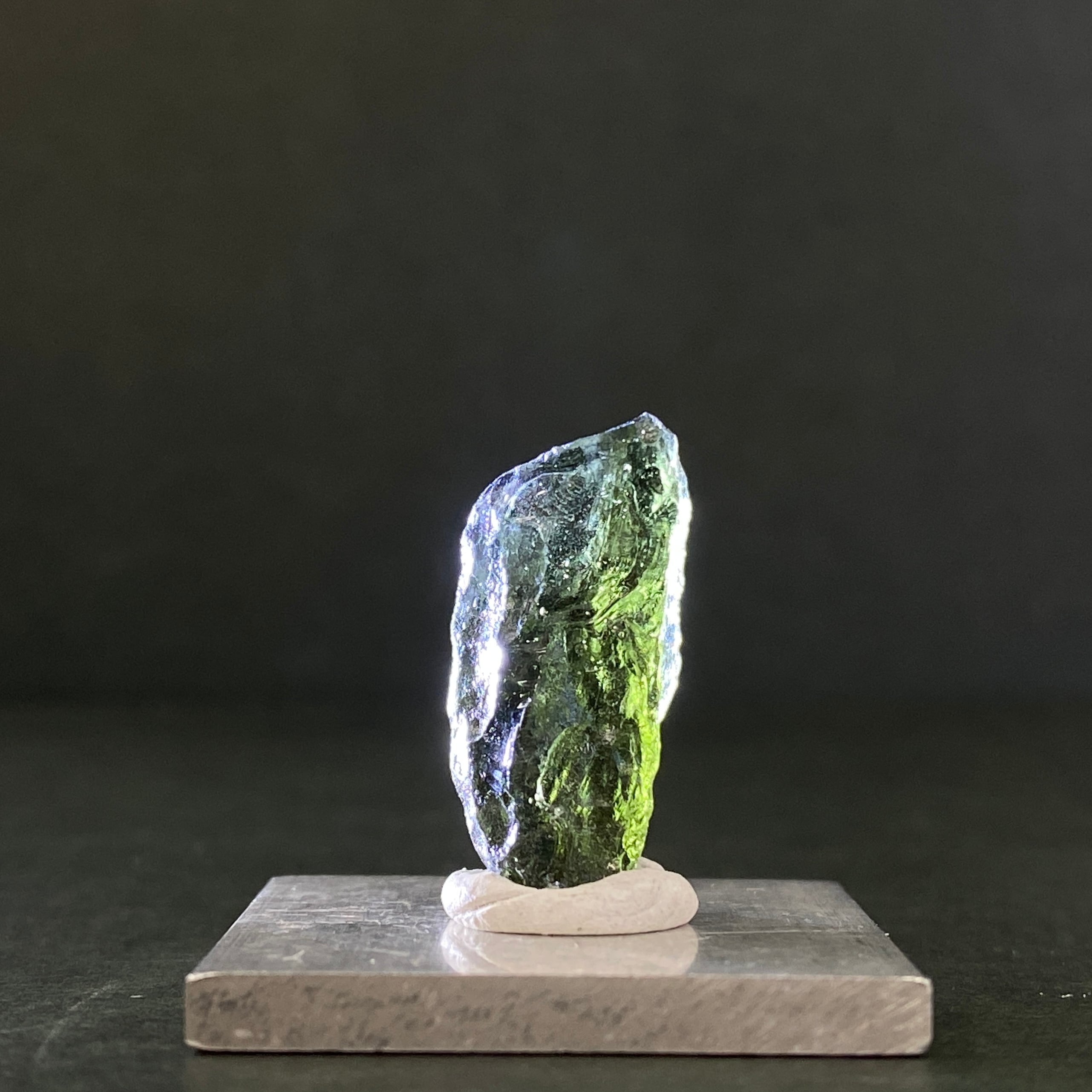 チェコで回収されたインパクトガラスです。近年、高騰し続けている隕石の1つで、形の綺麗なモルダバイトは年々少なくなっております。人気(需要)と在庫(供給)のバランスが崩れており、回収地の本場チェコでも偽物が量産されているほどです。本物のモルダバイトを手にしたいのであれば、安価で販売されているモルダバイトには手を出さないことをオススメします。ビーズのブレスレットや研磨された綺麗なモルダバイトも同様です。モルダバイトを購入する時にはご注意ください。