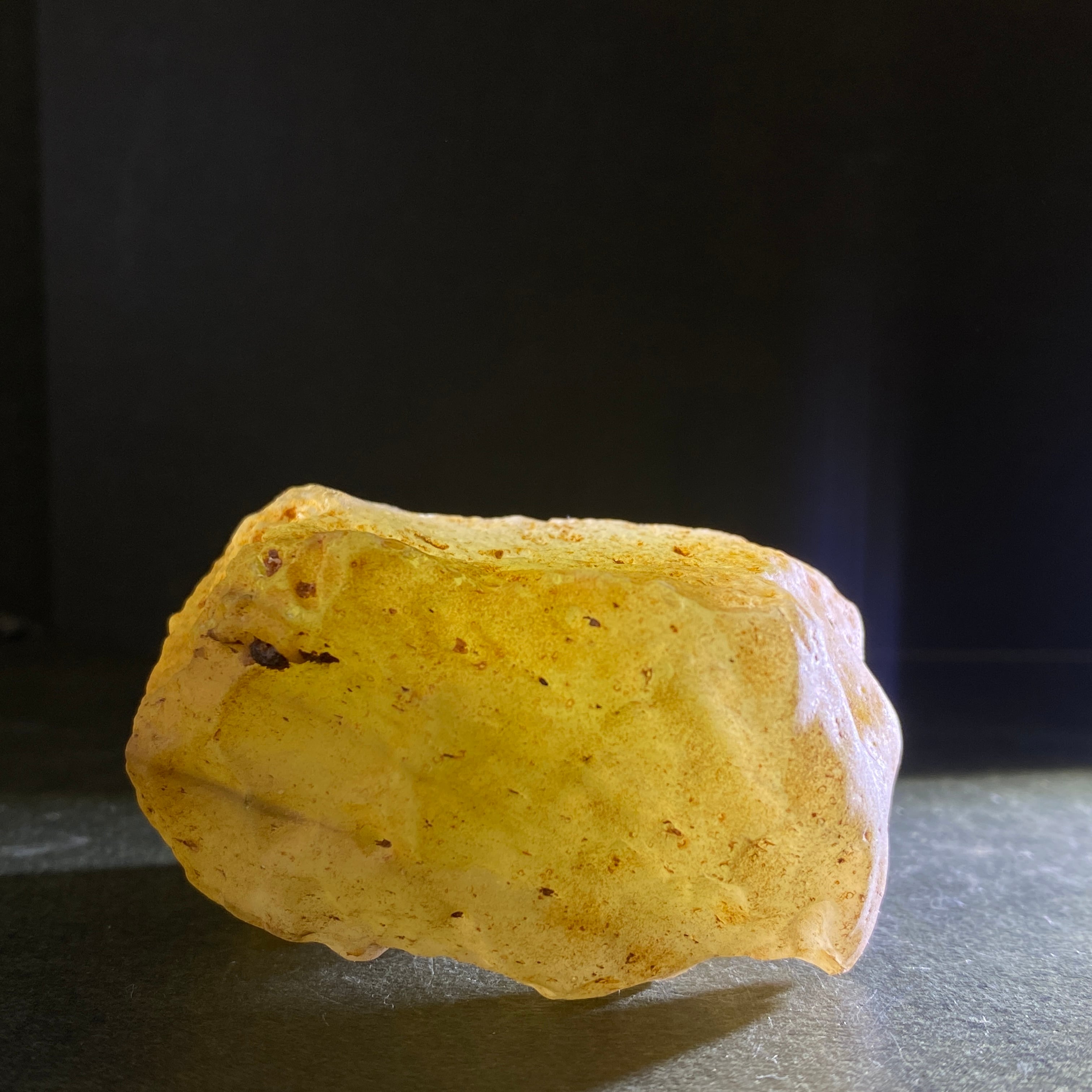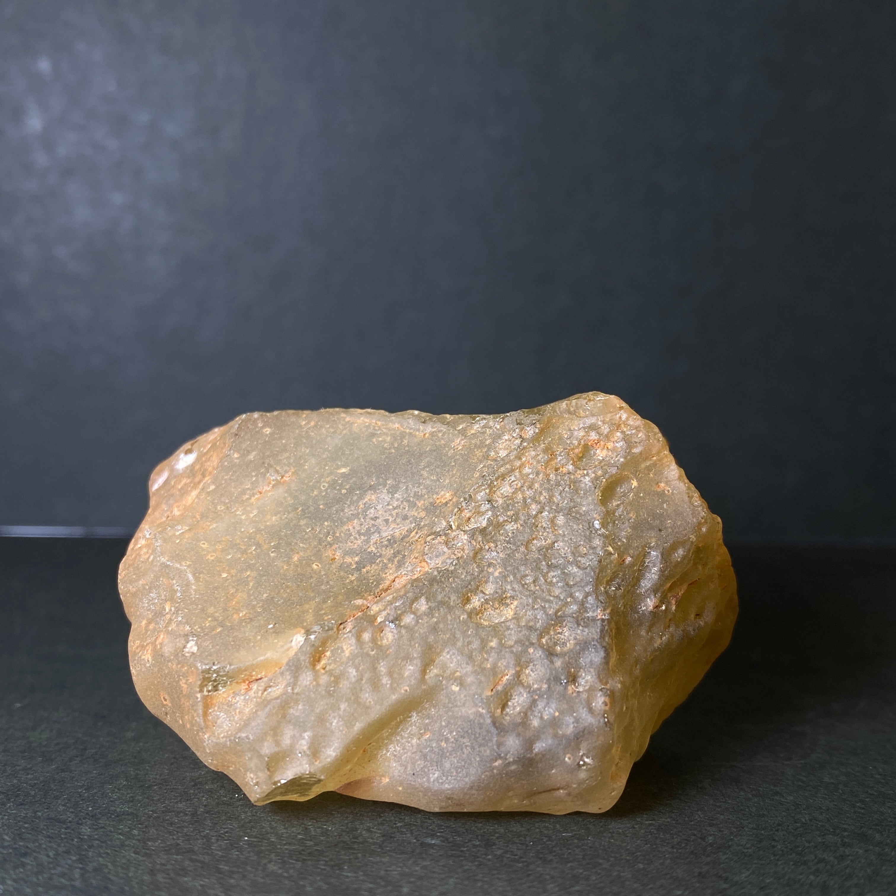 2600万年前のエジプトとのリビア国境近くでの大規模な隕石の衝撃によって形成されたインパクトガラスです。天然ガラスとも言われ、約98%の最も純粋なガラスだそうです。リビアングラスには、クリストバル石(クリストバライト)と呼ばれる白い気泡のような内包物があります。これは高温で形成された珪質の物質です。諸説ありますが、リビア東部とエジプト西部の砂漠には、1000トン以上のリビアンが散らばっていると言われています。その多くは小さいサイズですが、今まで発見された中で1番大きいリビアンは約26kgです。新石器時代、当時の人はリビアンを使ってガラスの道具を作り、後にエジプト人はそれらを使って宝石を作りました。ちなみに、エジプトにあるミラミッドのツタンカーメンの胸当てにちりばめられた石は、リビアングラスで作られています。