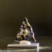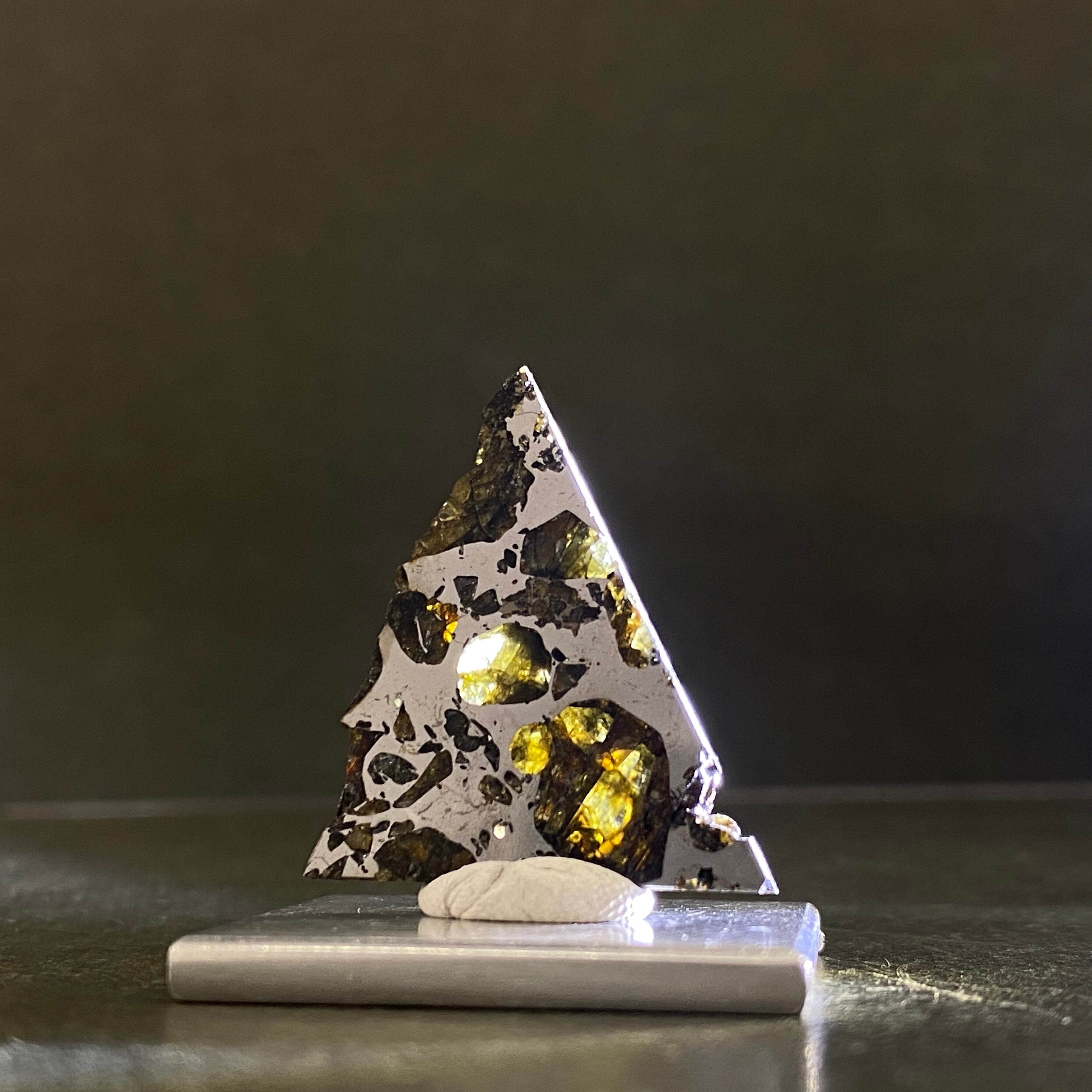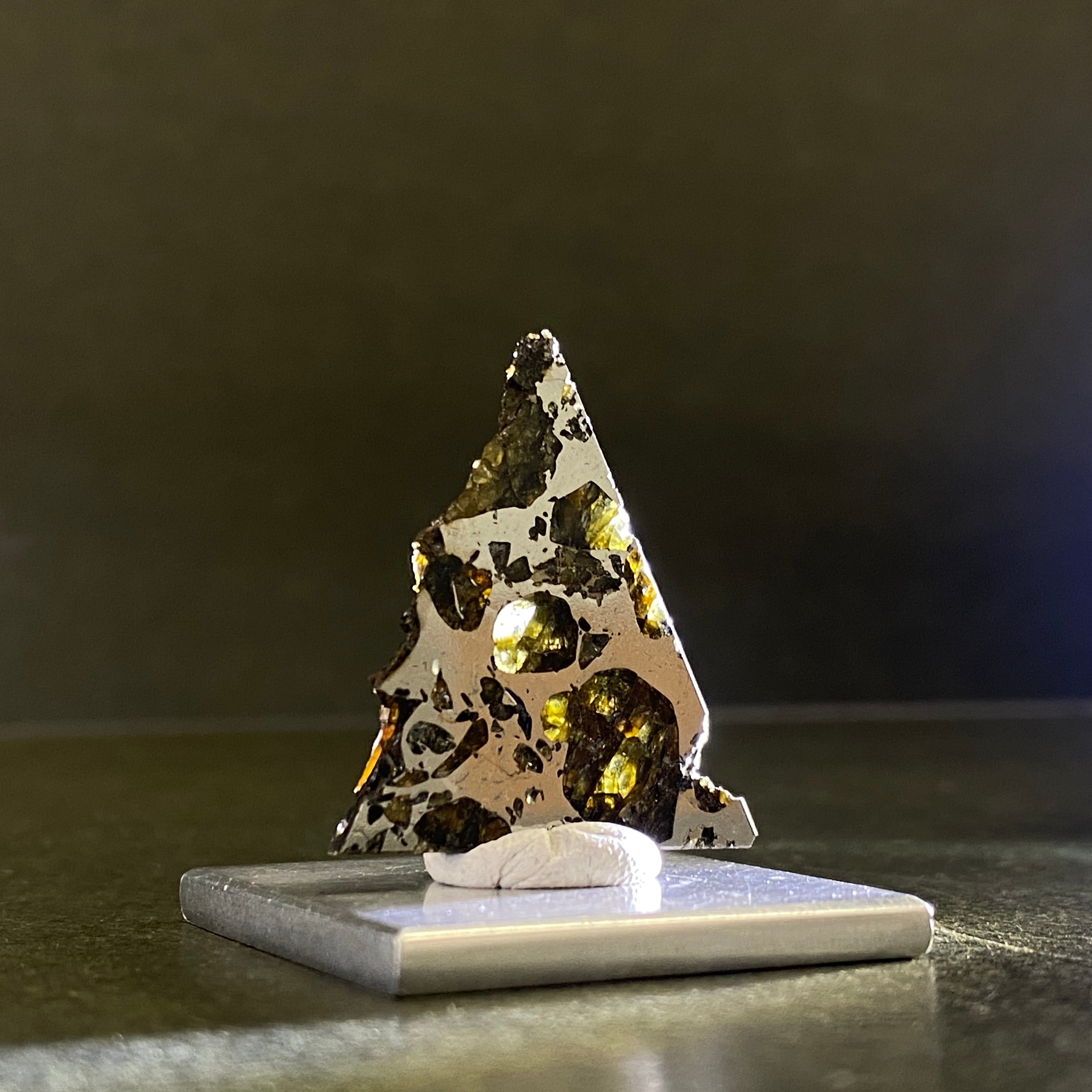 1967年にロシアで発見された隕石です。回収される隕石の中で約1%ほどしかない石鉄隕石(パラサイト隕石)の一種です。この隕石は部位によって値段が大きく変わります。パラサイト隕石の特徴であるカンラン石が満遍なく表現され、かつ、鉄部分とのバランスが美しい個体はとても高価で取引されています。エスケル隕石のように綺麗で透明度の高いオリーブ色のカンラン石があり、人気を高めています。また、鉄部分だけの個体もあります。カット方法によって鉄隕石、パラサイト隕石に区別される珍しい隕石で、とてもサビにくい隕石です。