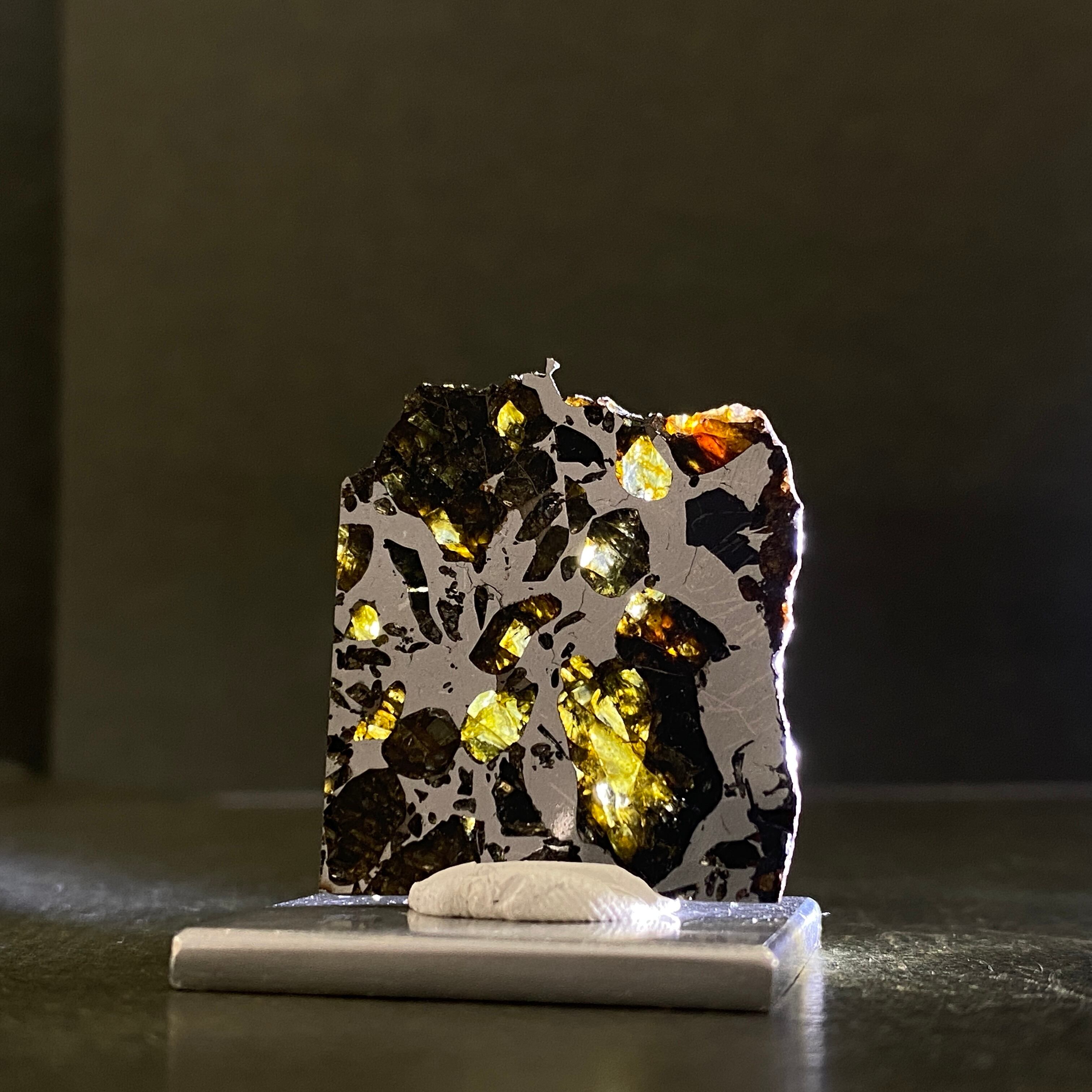 1967年にロシアで発見された隕石です。回収される隕石の中で約1%ほどしかない石鉄隕石(パラサイト隕石)の一種です。この隕石は部位によって値段が大きく変わります。パラサイト隕石の特徴であるカンラン石が満遍なく表現され、かつ、鉄部分とのバランスが美しい個体はとても高価で取引されています。エスケル隕石のように綺麗で透明度の高いオリーブ色のカンラン石があり、人気を高めています。また、鉄部分だけの個体もあります。カット方法によって鉄隕石、パラサイト隕石に区別される珍しい隕石で、とてもサビにくい隕石です。