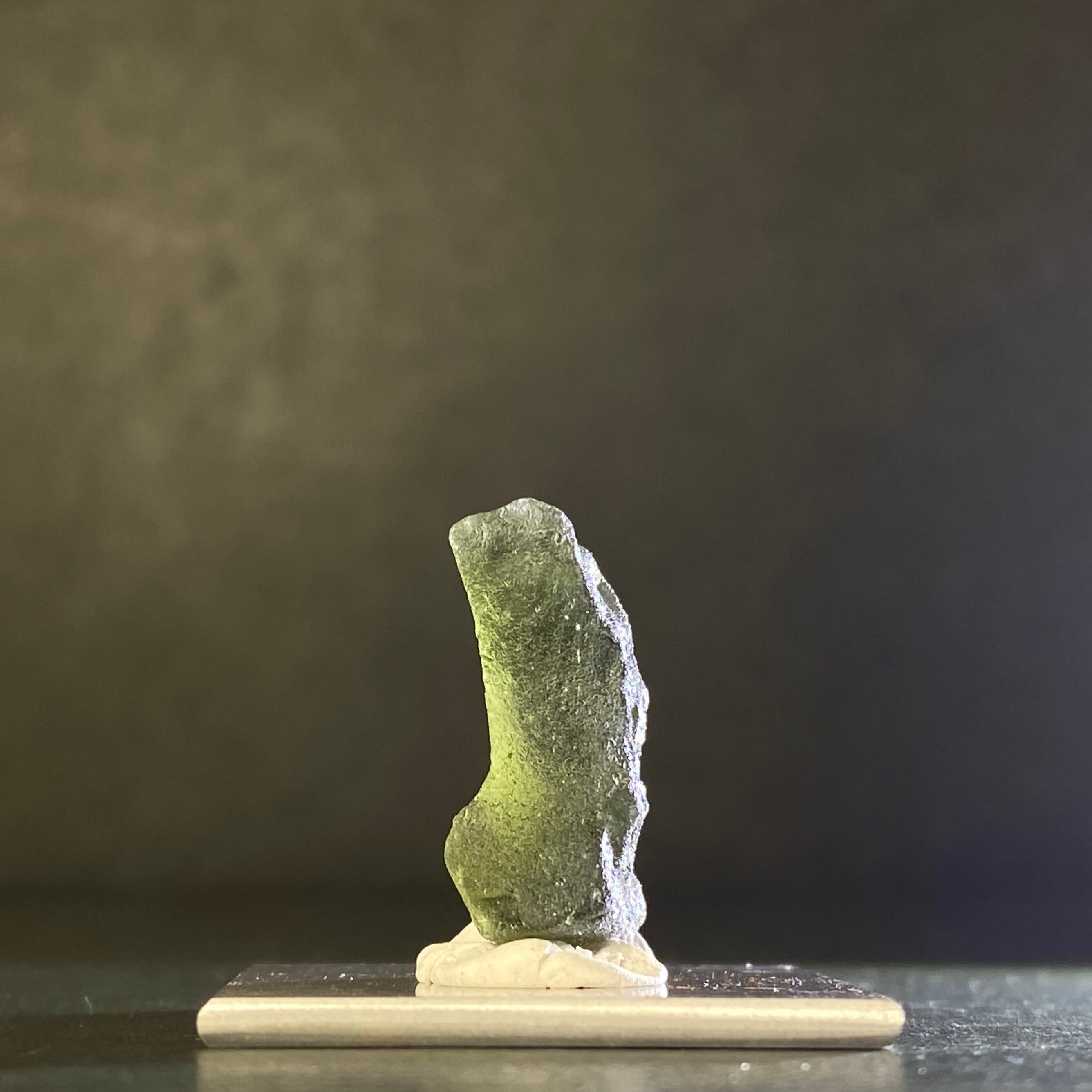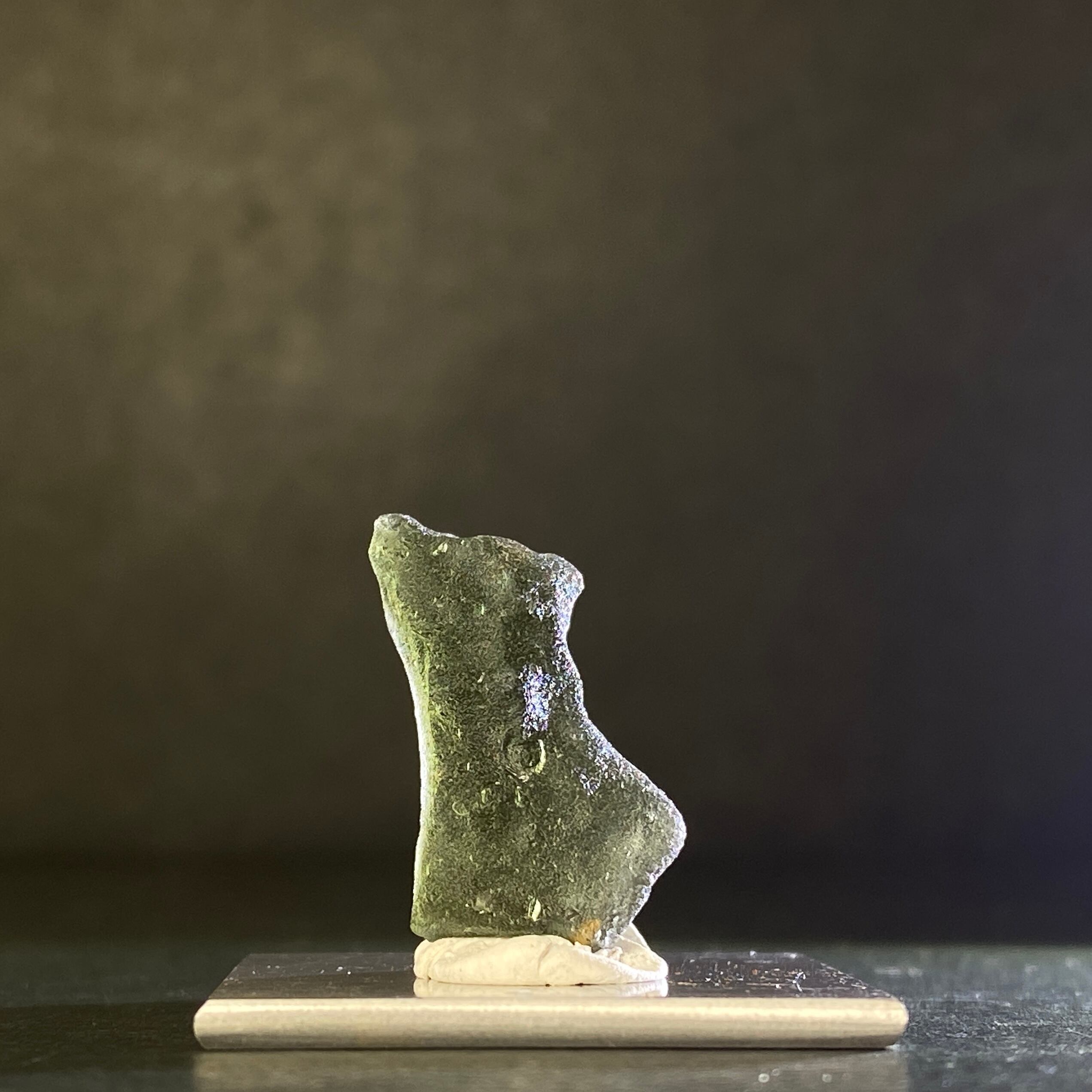 チェコで回収されたインパクトガラスです。近年、高騰し続けている隕石の1つで、形の綺麗なモルダバイトは年々少なくなっております。人気(需要)と在庫(供給)のバランスが崩れており、回収地の本場チェコでも偽物が量産されているほどです。本物のモルダバイトを手にしたいのであれば、安価で販売されているモルダバイトには手を出さないことをオススメします。ビーズのブレスレットや研磨された綺麗なモルダバイトも同様です。モルダバイトを購入する時にはご注意ください。